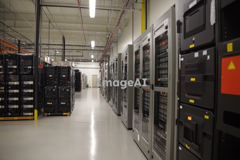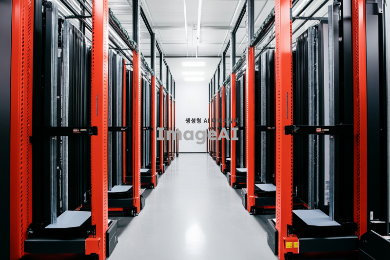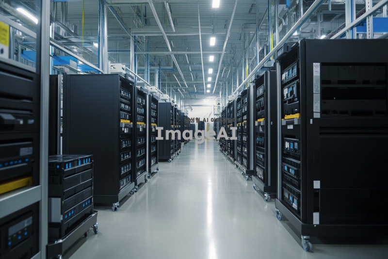 2차전지 물류 창고 내부, 현대적인 디자인의 랙과 스태커가 정렬되어 있는 모습, 효율적인 공간 활용을 보여주는 구조, 밝고 깨끗한 환경, 자동화된 시스템 느낌, 첨단 기술이 적용된 모습, 산업적인 분위기, 정돈된 배치,