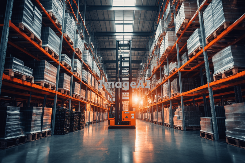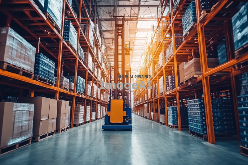 산업 창고 내부에서 작동 중인 스토커 크레인과 랙 시스템, 현대적인 창고 환경, 높은 천장과 넓은 공간, 정돈된 물류 시스템, 2차전지 배터리가 랙에 정리된 모습, 스토커 크레인이 자동으로 물건을 이동시키는 장면, 밝고 깨끗하며 효율적인 작업 환경, 기술과 자동화가 강조된 분위기.