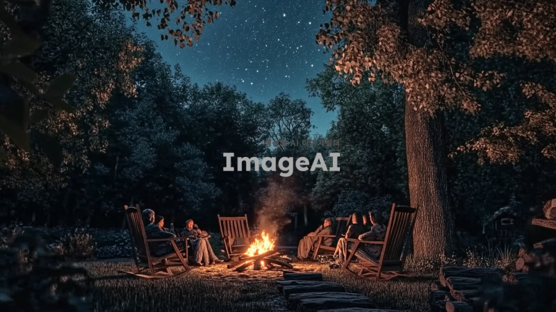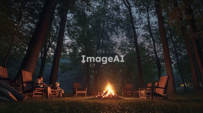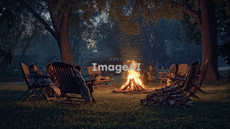 어두운 숲 속에서 따뜻하게 타오르는 모닥불, 주변에는 편안한 나무 의자들이 놓여 있고, 사람들이 담요를 두르고 앉아 있다. 밤하늘에는 밝은 별들이 반짝이고, 부드러운 바람이 나뭇잎을 살짝 흔든다. 모닥불의 불빛이 사람들의 얼굴을 은은하게 비추며, 주변에는 나무와 풀들이 자연스럽게 어우러져 있다. 모닥불 옆에는 작은 나무 장작 더미가 쌓여 있고, 멀리서 부엉이 소리가 들린다.