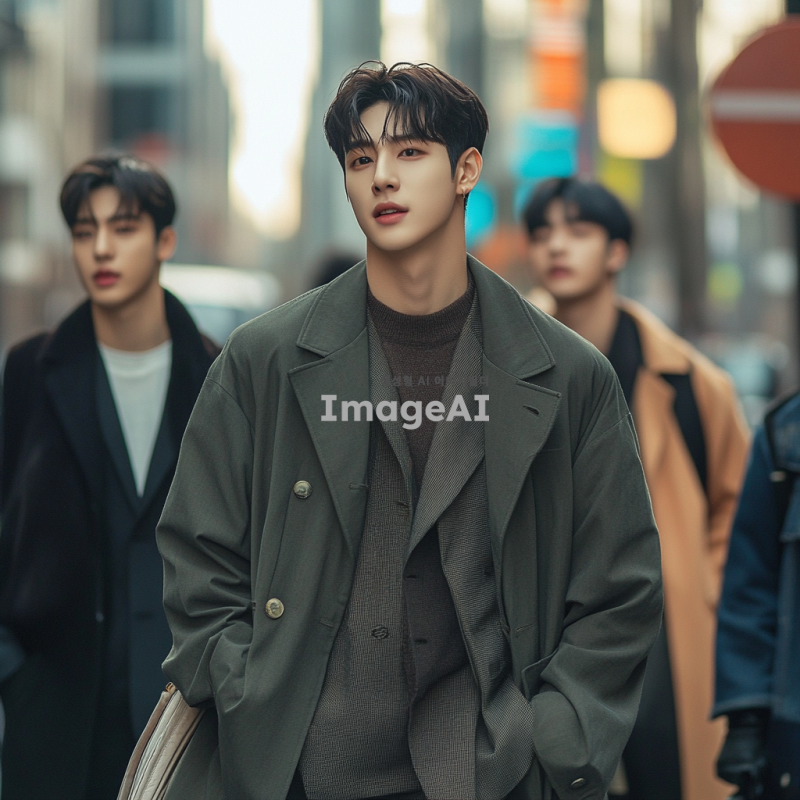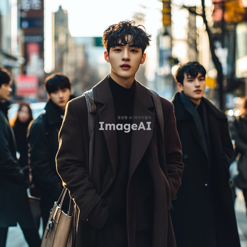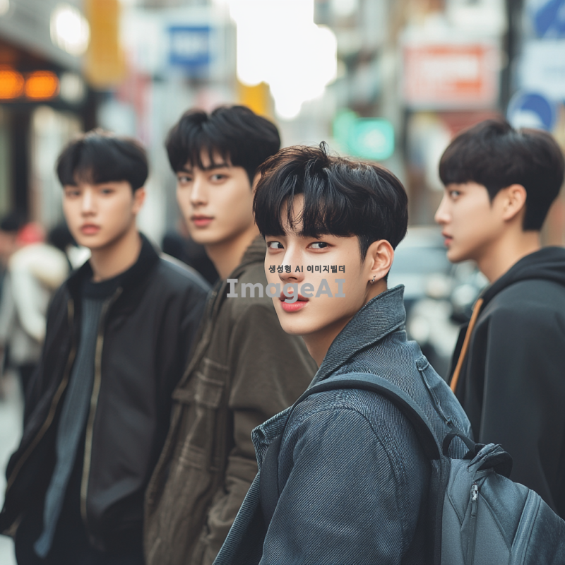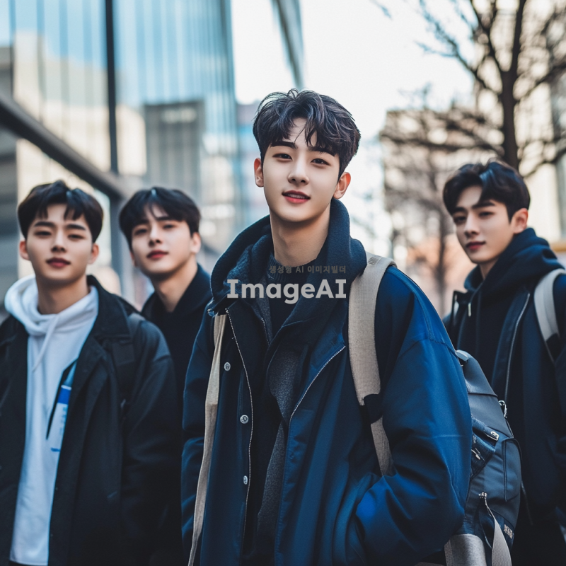 잘생긴 한국 남학생들이 함께 있는 장면, 각각 다른 스타일과 패션을 가진 학생들, 캐주얼한 옷차림부터 세련된 정장까지 다양한 스타일을 보여주는 모습, 자연스러운 포즈와 표정, 배경은 현대적인 도시 거리, 밝고 생동감 있는 분위기.