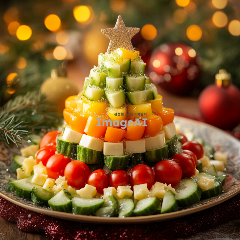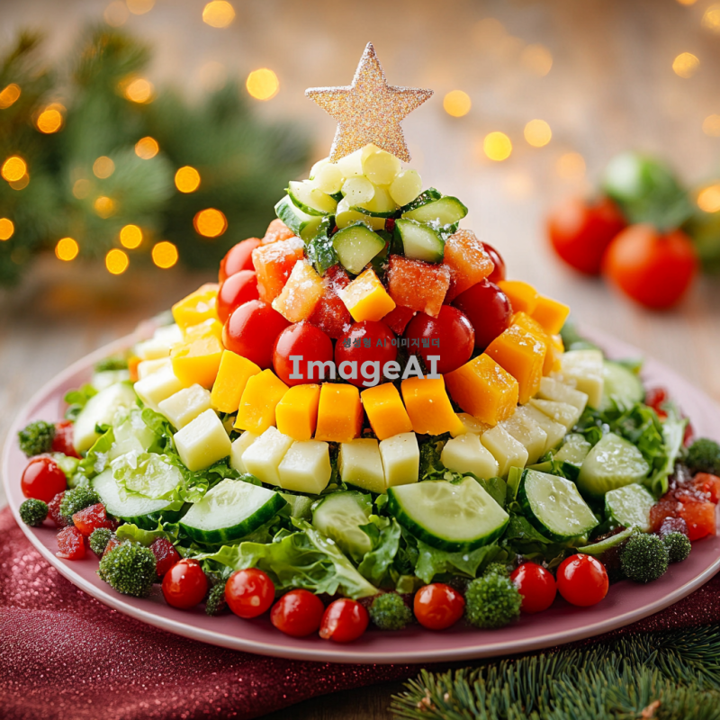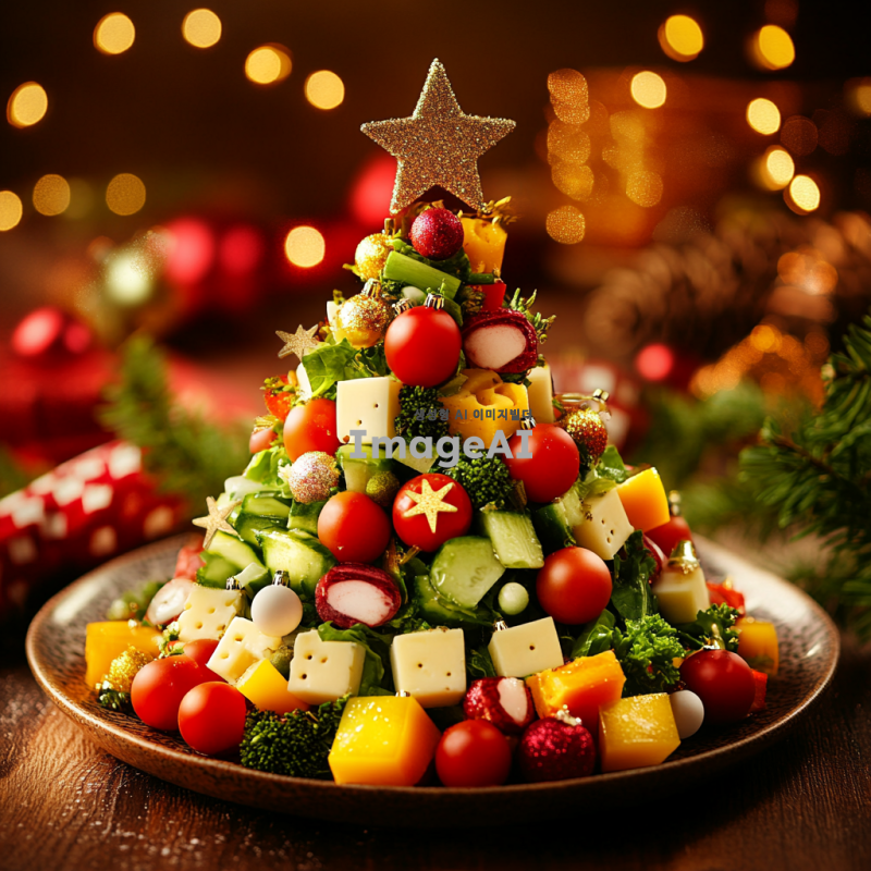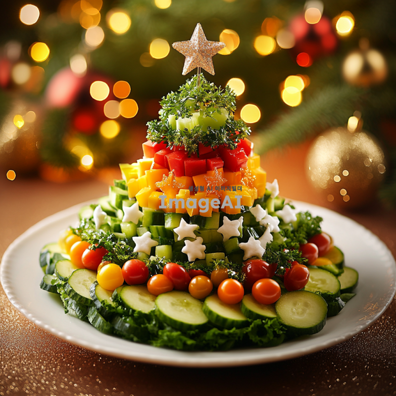 크리스마스 분위기의 접시에 크리스마스 트리 모양으로 정성스럽게 장식된 샐러드, 다양한 녹색 채소와 함께 빨강, 노랑, 주황색의 채소로 장식된 모습, 반짝이는 별 모양의 치즈 조각과 작은 방울토마토가 트리 장식처럼 배치된 샐러드, 배경은 따뜻하고 아늑한 크리스마스 분위기, 부드러운 조명 아래에서 반짝이는 느낌.