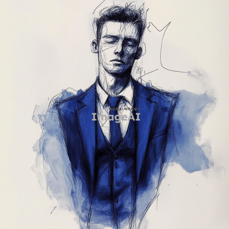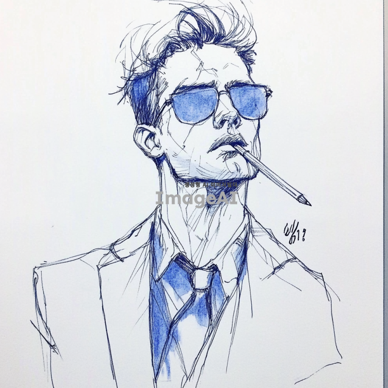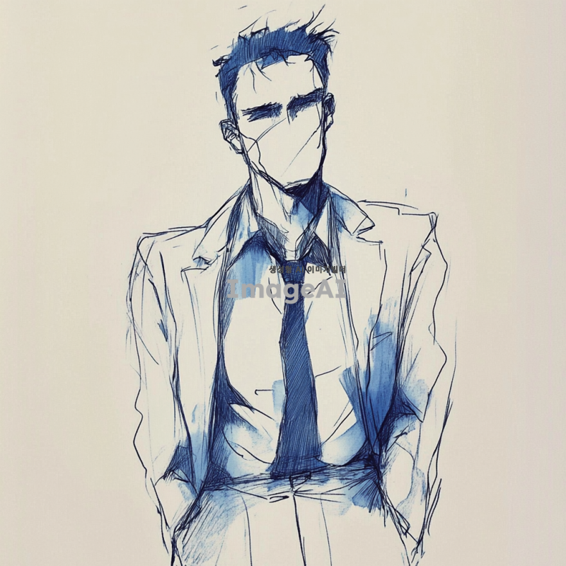 이 사진 이미지를 컨투어링 기법으로 선이 많이 사용된 것 처럼 러프하게 연필로 만든 것 처럼 해 주세요 색상은 딥한 블루를 간간히 포인트에 넣어주시구요 옷은 약간 정장처럼 깔끔하게 만들어주세요