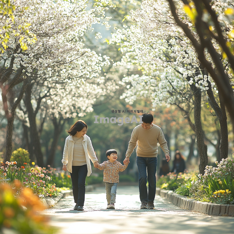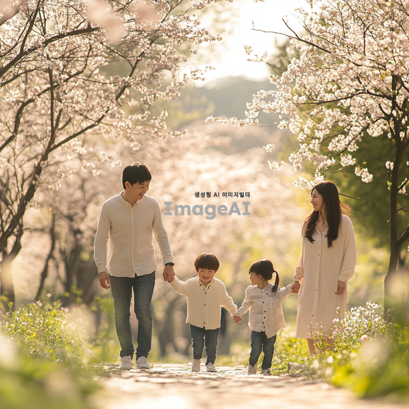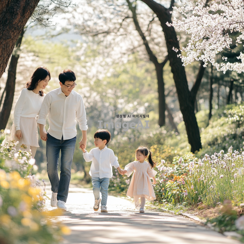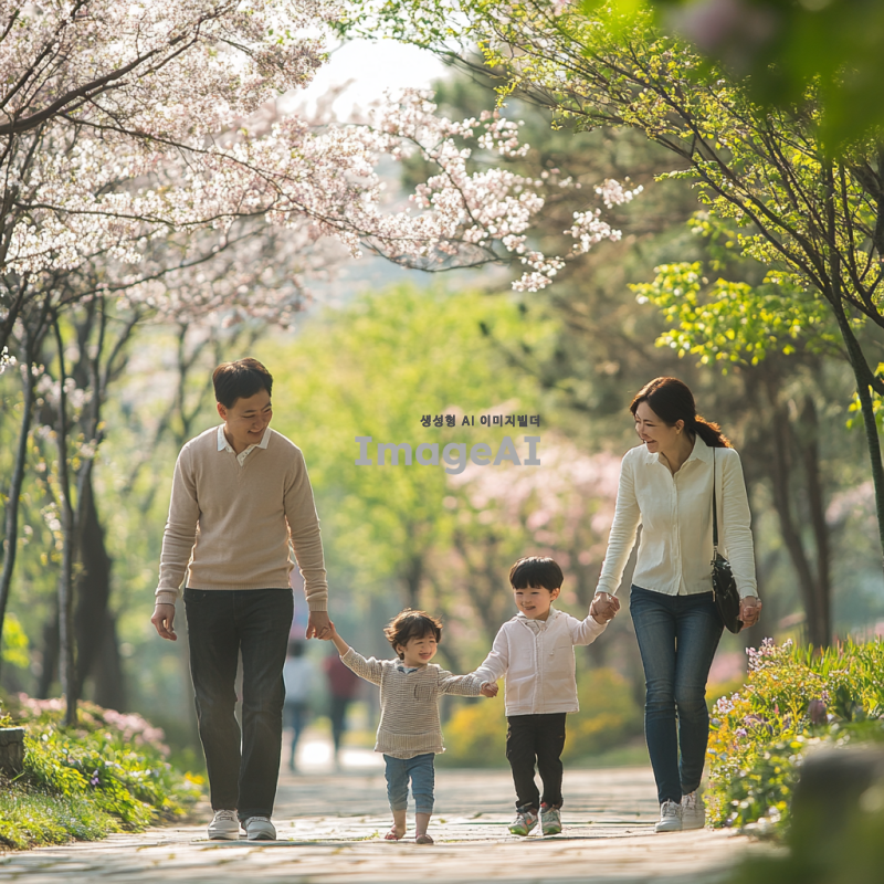 밝은 햇살 아래에서 산책 중인 한국인 가족, 부모와 두 아이가 함께 손을 잡고 공원 길을 걷고 있는 모습, 주변에는 다양한 나무와 꽃들이 만발해 있으며, 가족의 얼굴에는 행복한 미소가 가득하다, 자연스럽고 편안한 분위기, 가족 간의 따뜻한 유대감을 강조
