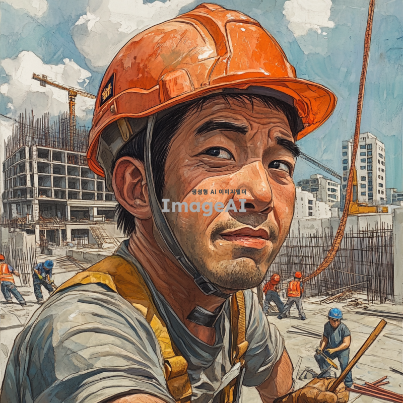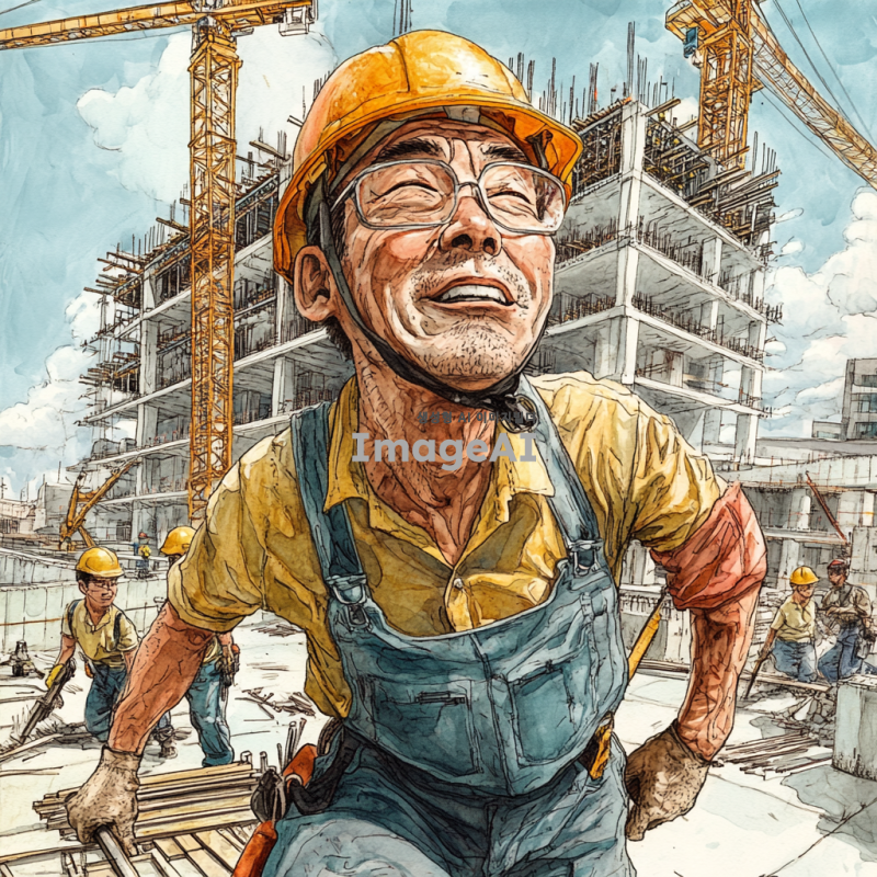 한국의 건설 현장에서 일하는 건설노동자의 캐리커쳐 안전모와 작업복을 착용하고 있으며, 배경에는 철근콘크리트 건설되고 있는 모습이 보인다. 노동자는 햇빛 아래에서 작업 도구를 사용하며, 땀을 흘리고 있는 모습이 자연스럽게 표현된다. 주변에는 다른 노동자들이 함께 작업하는 모습도 포함되어 있으며, 현장의 활기찬 분위기가 잘 드러난다.