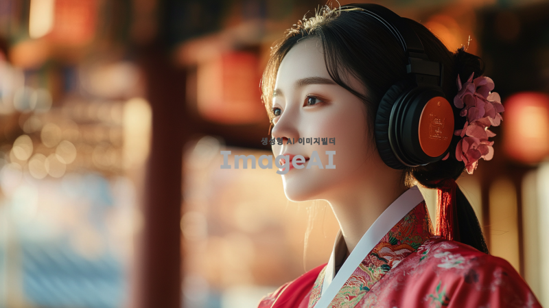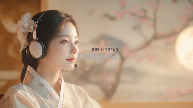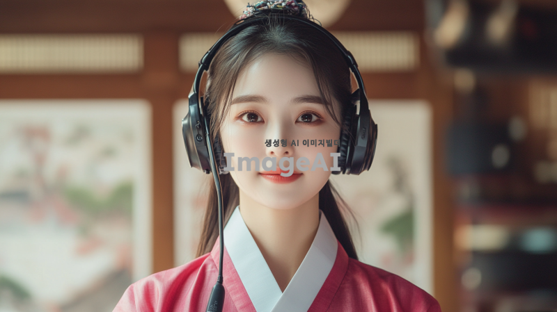 한복을 입고 있는 한국인 여성이 헤드셋을 쓰고 있는 모습, 전통적인 한복의 아름다움과 현대적인 헤드셋이 조화를 이루는 장면, 배경은 은은한 한국 전통 문양이 있는 실내 공간, 여성의 표정은 편안하고 집중된 모습, 자연스러운 조명과 부드러운 색감.