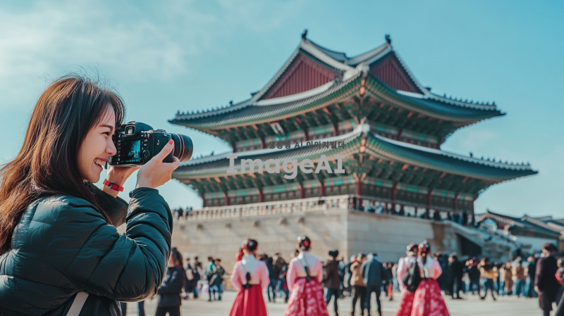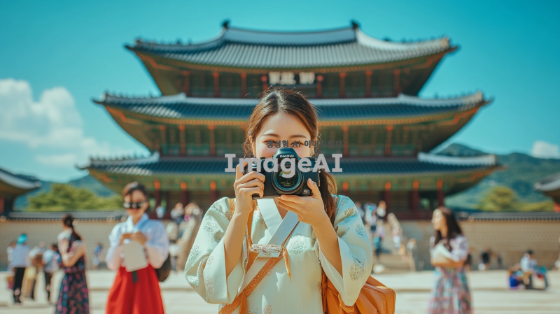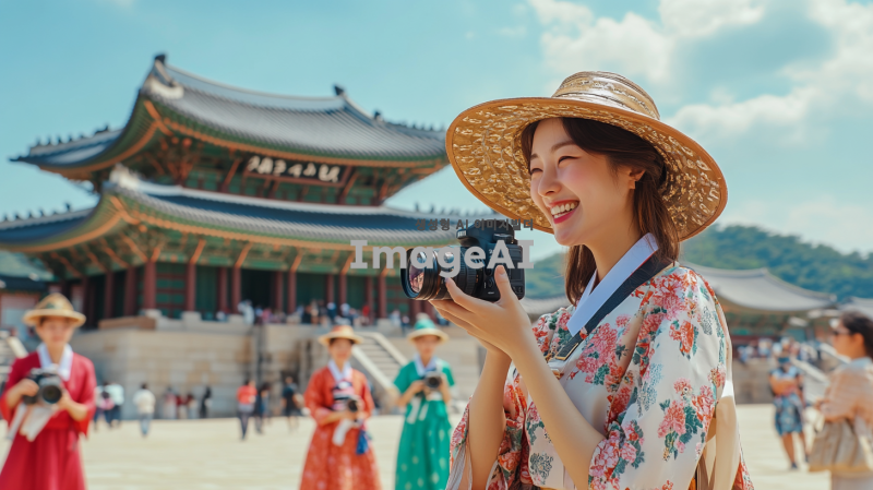 경복궁의 전통 건축물 앞에서 기념사진을 찍고 있는 외국인 관광객, 관광객은 카메라를 들고 있으며 미소를 짓고 있다, 주변에는 한복을 입은 다른 관광객들도 보인다, 경복궁의 고유한 건축 양식과 화려한 색채가 돋보이는 장면, 맑은 하늘과 따뜻한 햇빛이 비치는 날씨.