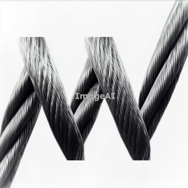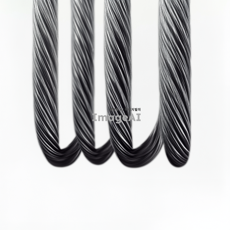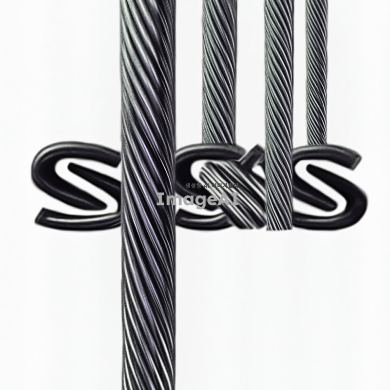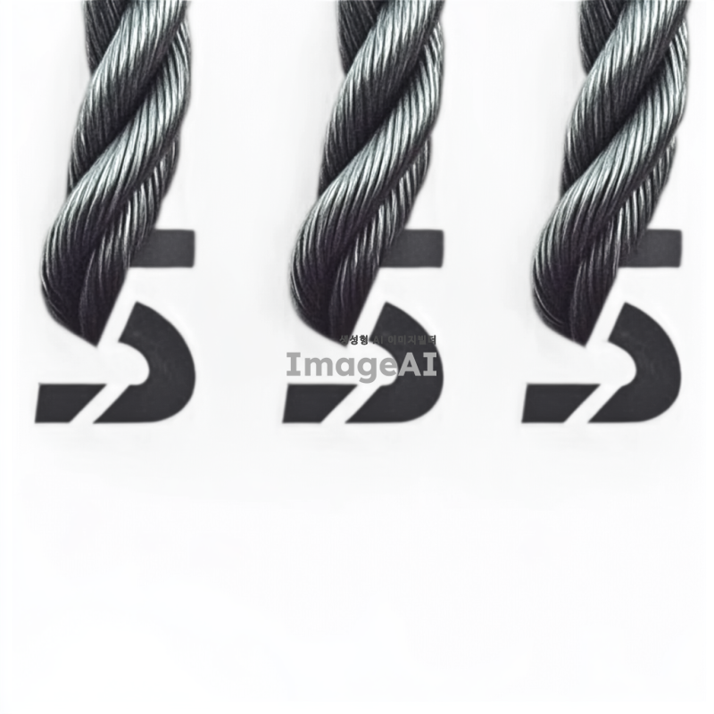 W를 형성하는 3개의 와이어로프가 나란히 배치된 이미지, 각각의 와이어로프는 강하고 튼튼한 느낌을 주며, 금속의 질감이 잘 드러나도록 표현. SS는 깔끔한 검정색 3줄로, 단순하고 선명하게 배치된 이미지. 배경은 흰색으로 설정하여 와이어로프와 검정 줄이 명확하게 보이도록 함.