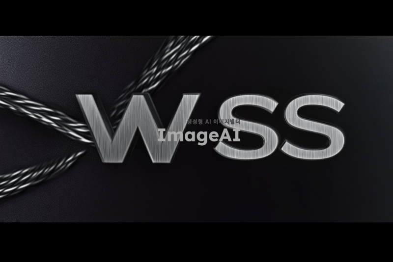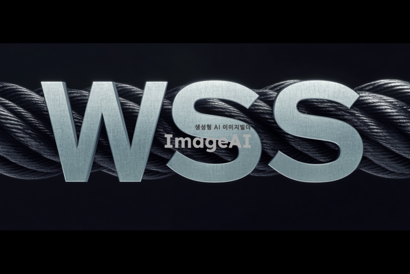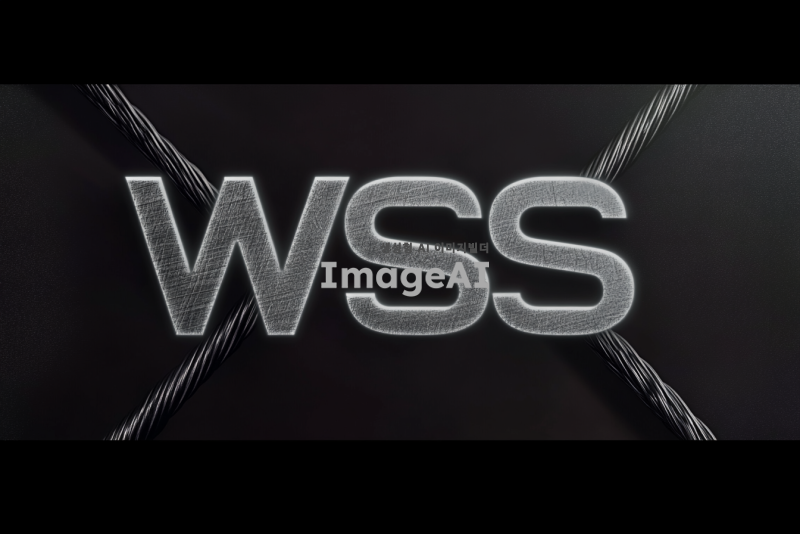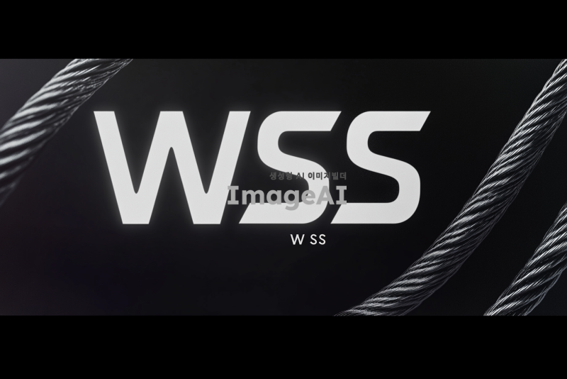 검은 배경에 흰색 글씨로 "WSS"를 중앙에 배치하고, "W"는 와이어로프의 질감을 가진 금속 느낌으로 표현하고, "SS"는 깔끔하고 현대적인 서체로 디자인. 와이어로프의 디테일이 돋보이도록 조명을 활용하여 입체감을 더함.