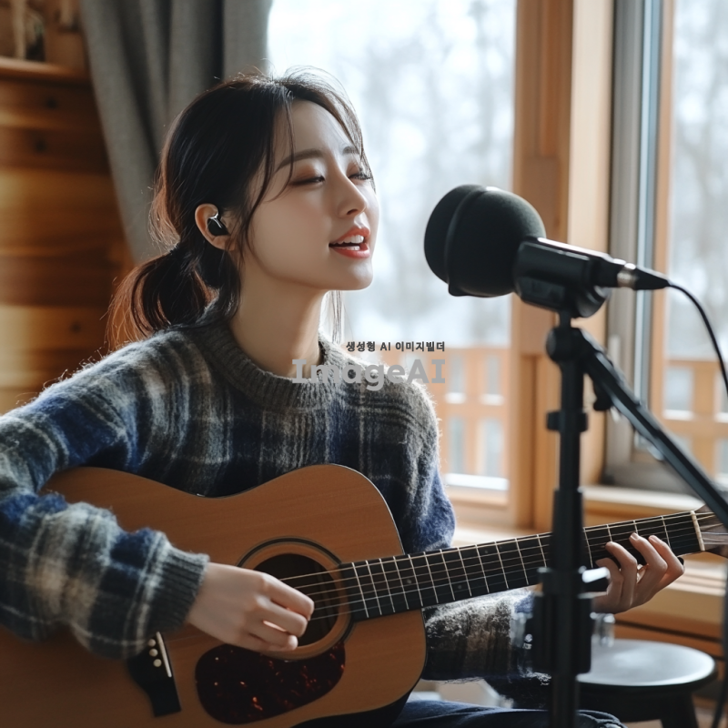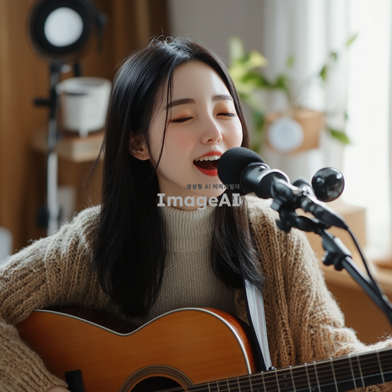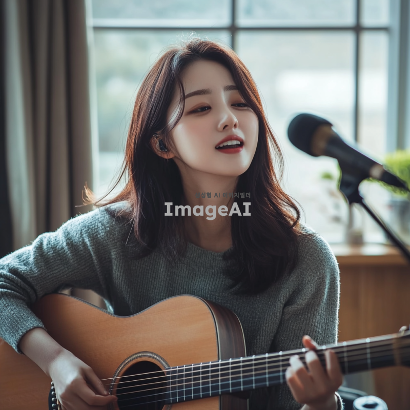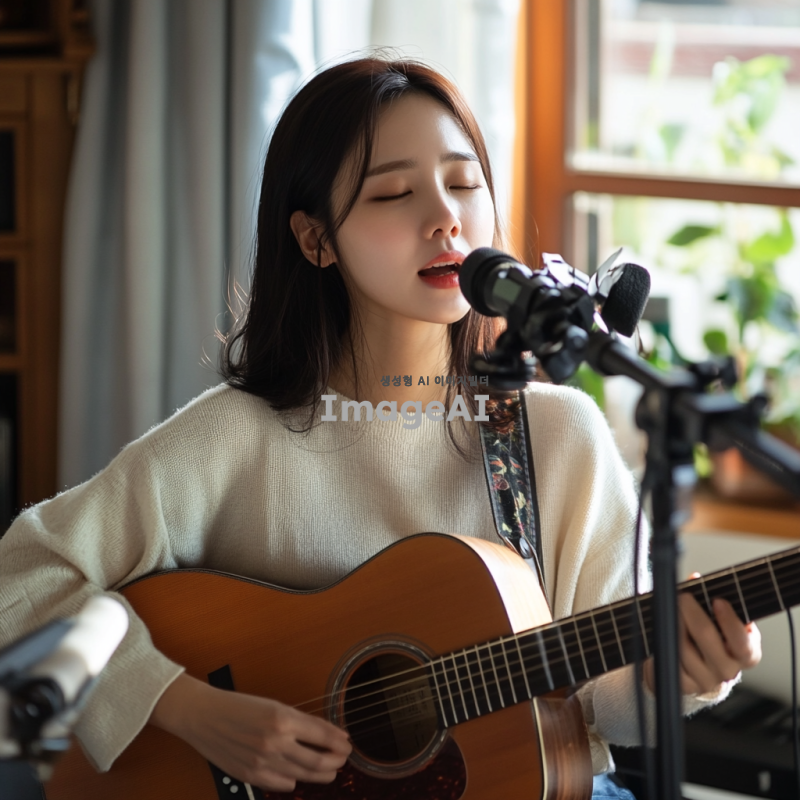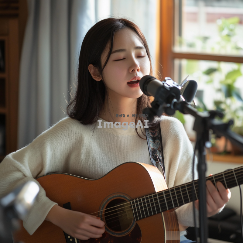 집에서 기타를 치며 노래를 녹음하는 한국여성