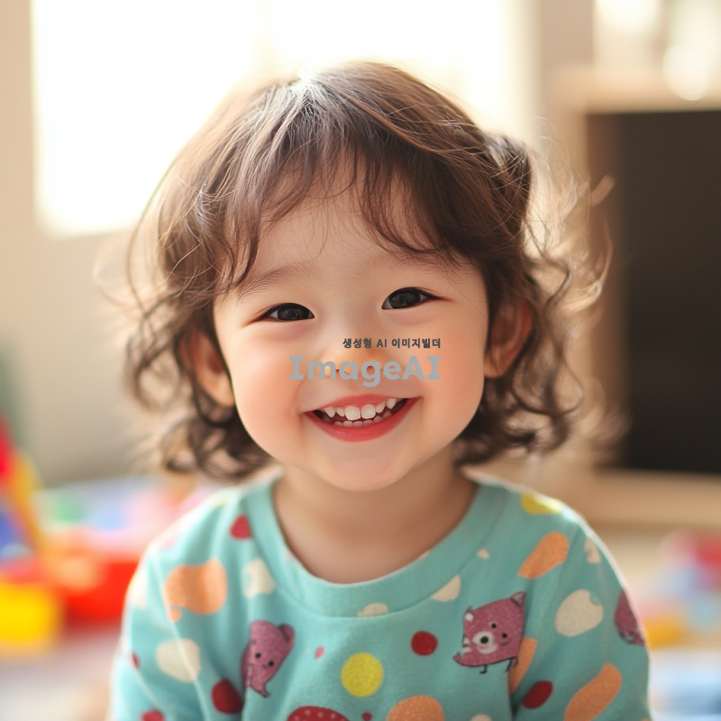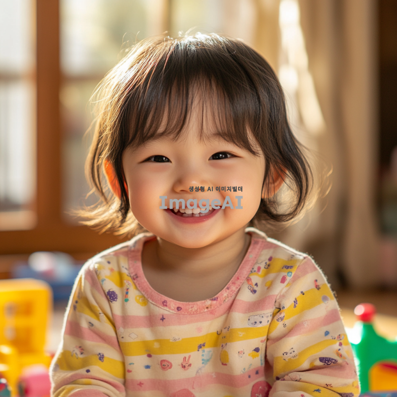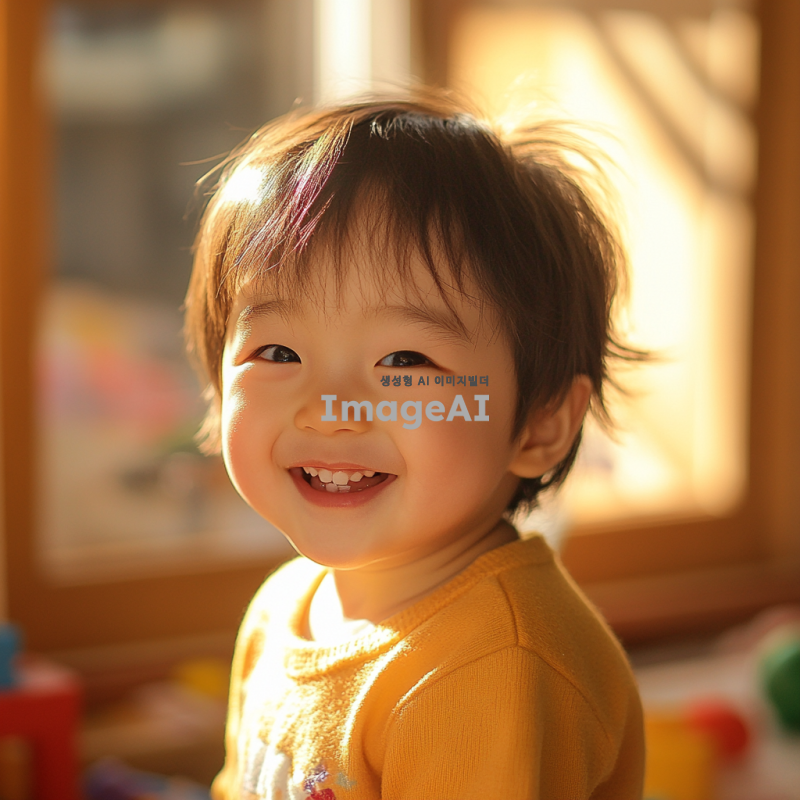 밝고 화사한 배경에서 웃고 있는 귀여운 3살 한국 아이, 밝은 색상의 옷을 입고 있으며, 주변에 장난감들이 흩어져 있는 모습, 따뜻한 햇살이 비치는 실내 공간, 아이의 얼굴에 행복한 미소가 가득하며, 천진난만한 표정으로 카메라를 바라보고 있는 장면.