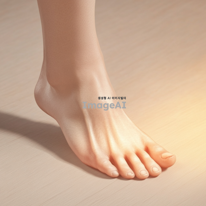 무지외반증을 가진 한국인 여성의 발을 클로즈업한 이미지, 발가락이 비정상적으로 휘어져 있는 모습, 자연스러운 조명 아래에서 피부의 질감이 잘 드러나도록 표현, 의료적인 분위기를 강조하기 위해 깨끗하고 단순한 배경, 발의 윤곽이 명확하게 드러나도록 촬영