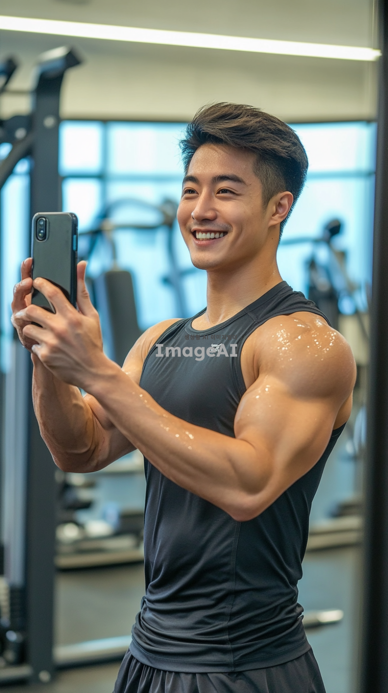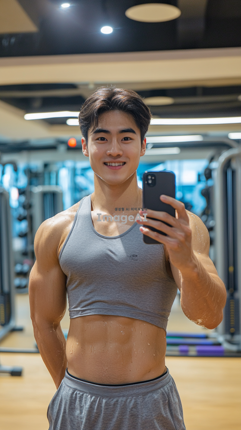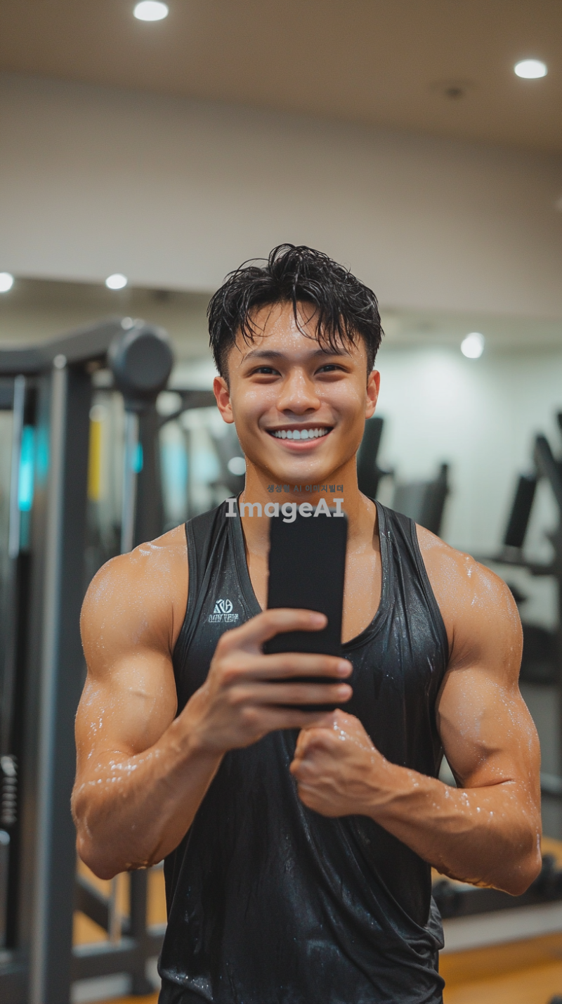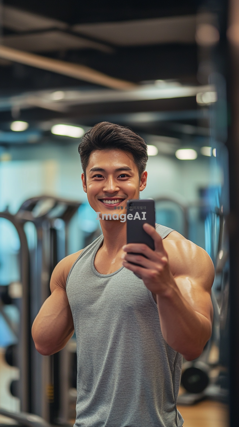 헬스장에서 운동을 마친 후 거울 앞에서 셀카를 찍고 있는 젊은 동양인 남성. 남성은 운동복을 입고 있으며, 땀에 젖은 모습이 건강하고 활기찬 느낌을 준다. 배경에는 다양한 운동기구들이 보이며, 헬스장의 현대적이고 깨끗한 분위기가 느껴진다. 남성은 스마트폰을 들고 자연스럽게 미소 짓고 있다.