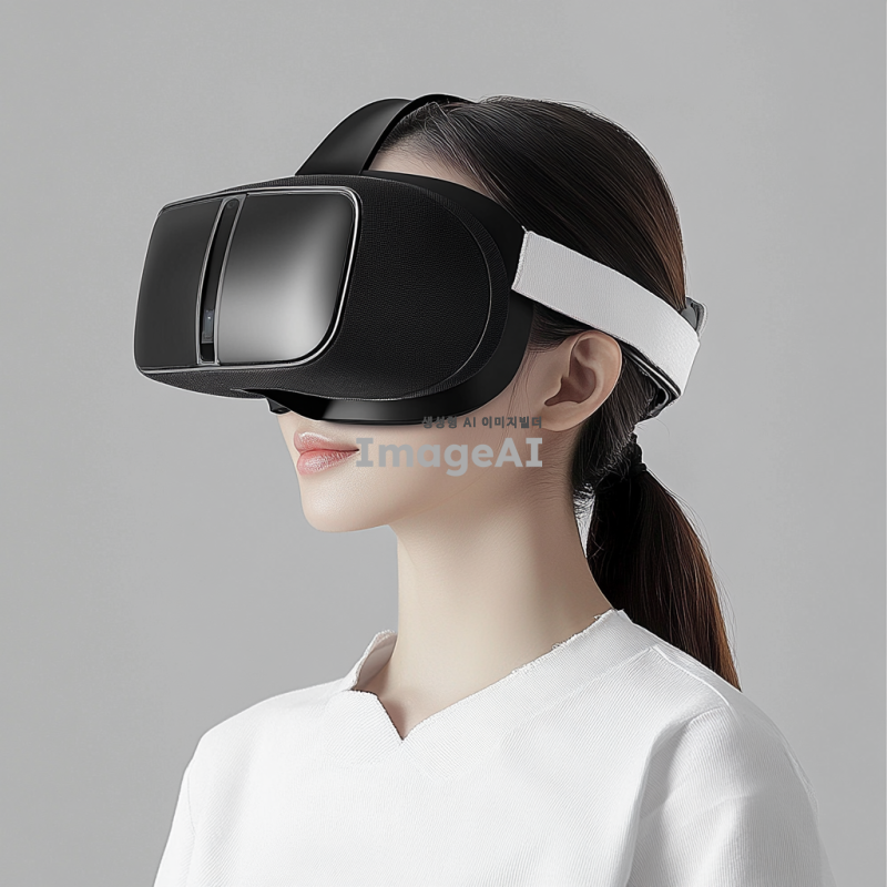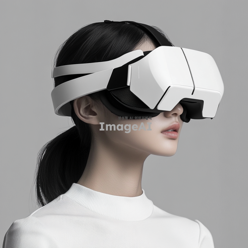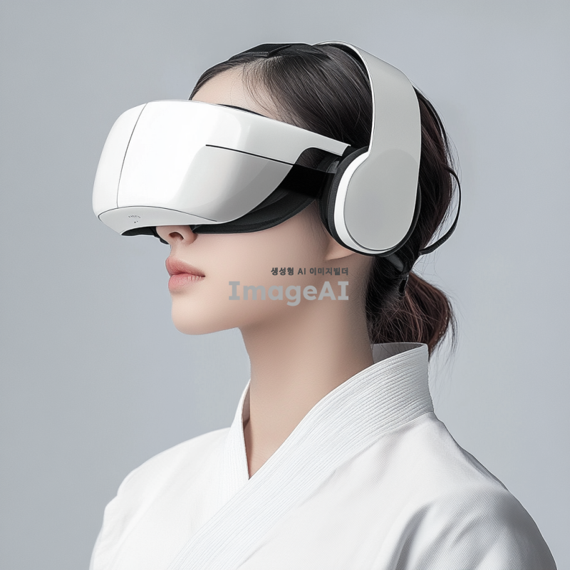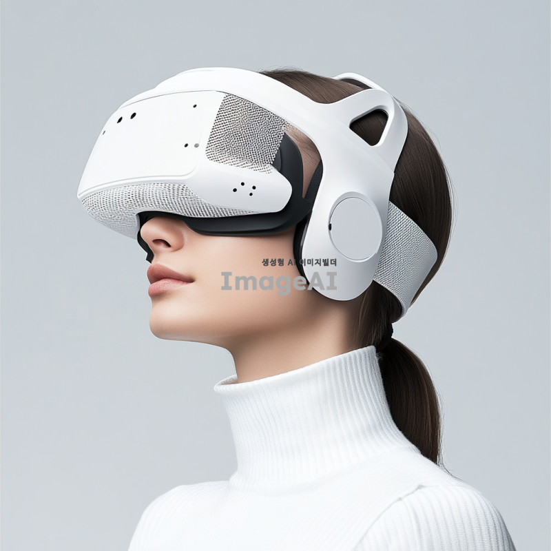 태권도 헤드기어 형태의 스포츠 VR 헤드기어 디자인, 끈 조절 가능, 공간 음향 스피커 내장, 진동 센서 장착, 턱 끈 길이 조절 가능, 통풍이 가능한 소재 사용, 작은 선풍기 내장. 현대적이고 기능적인 디자인, 깔끔하고 세련된 외관, 사용자 편의성을 고려한 인체공학적 설계.