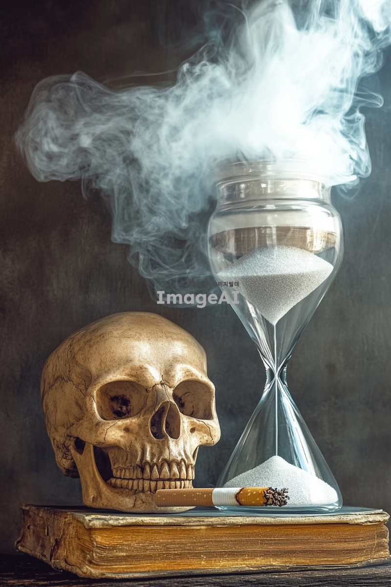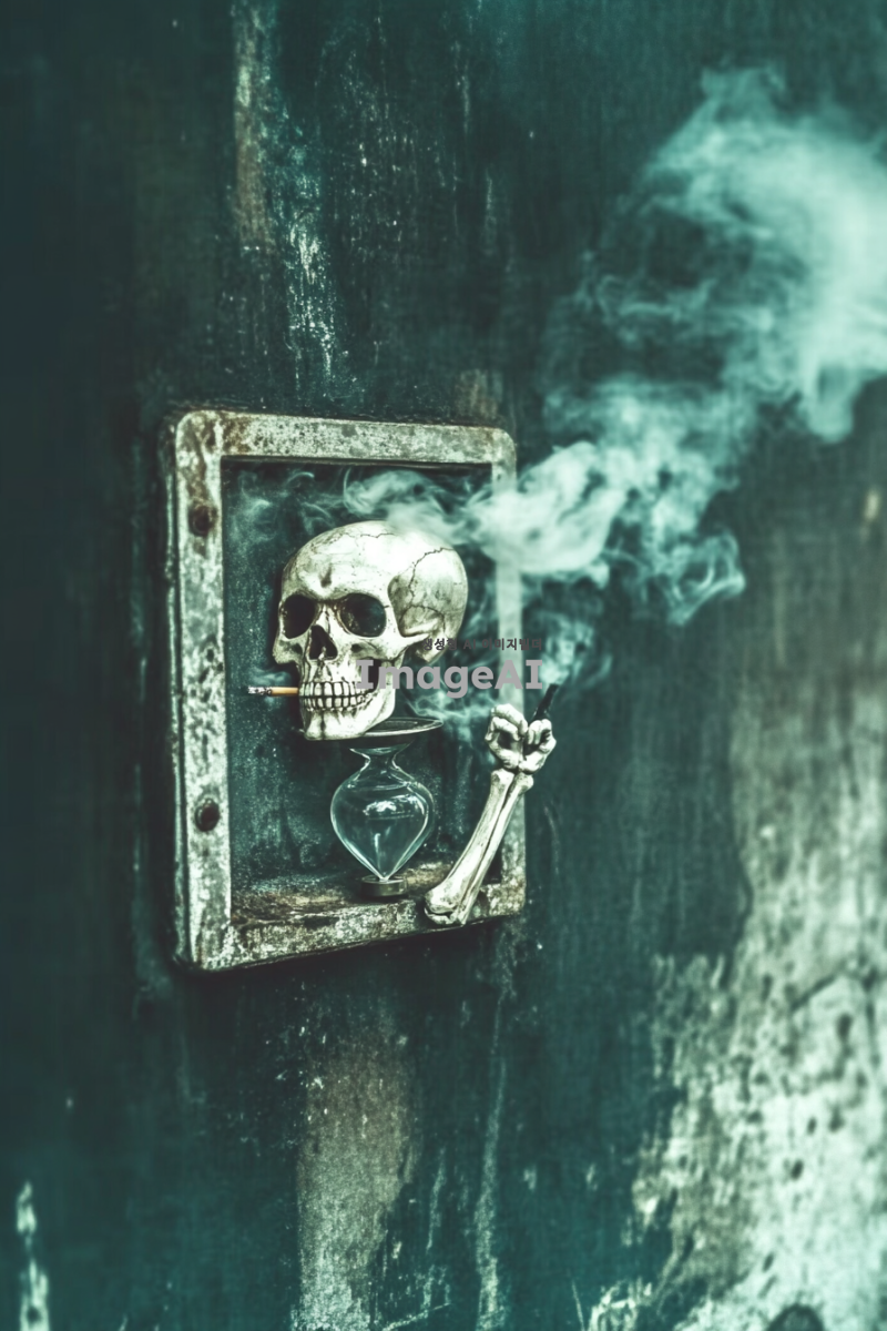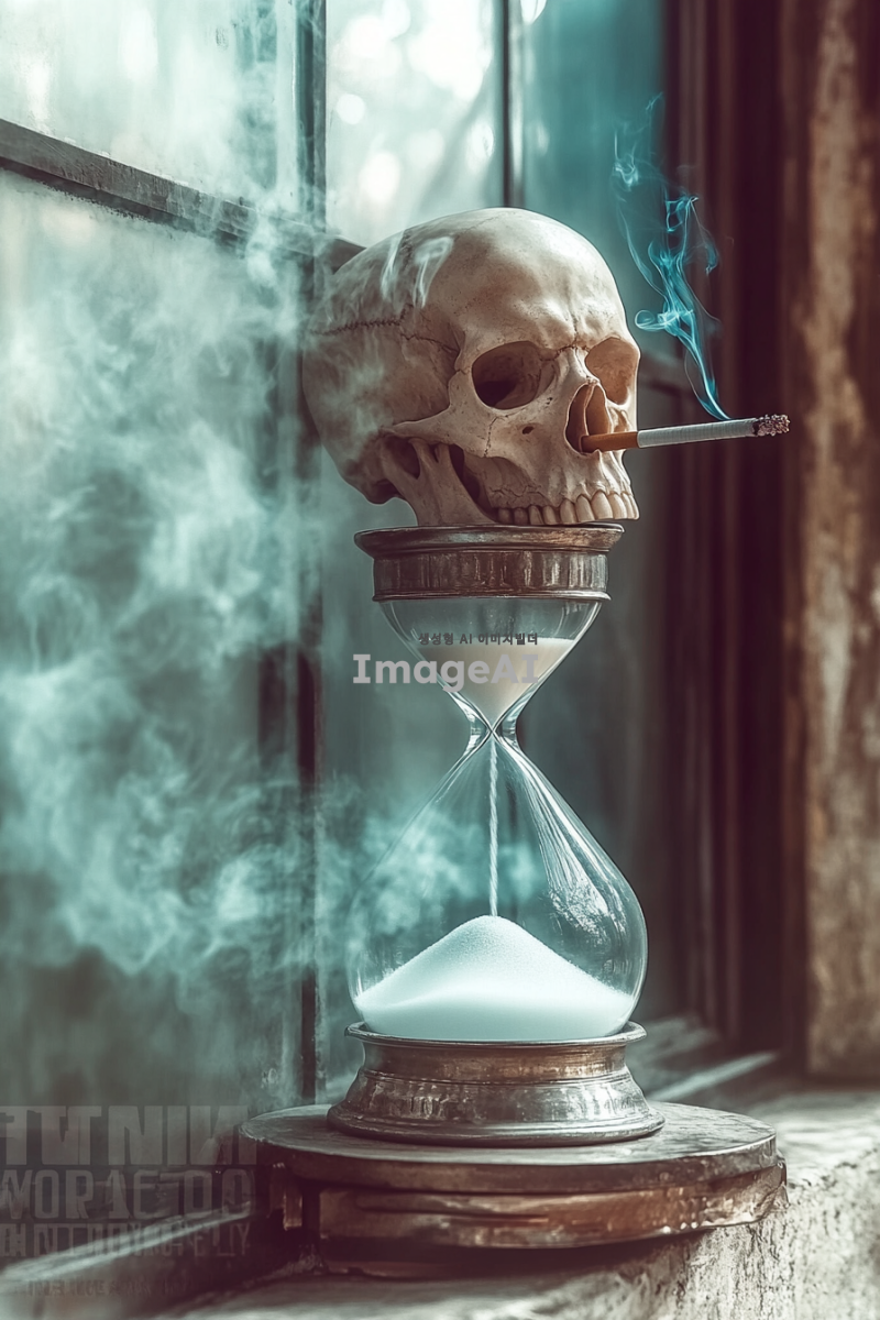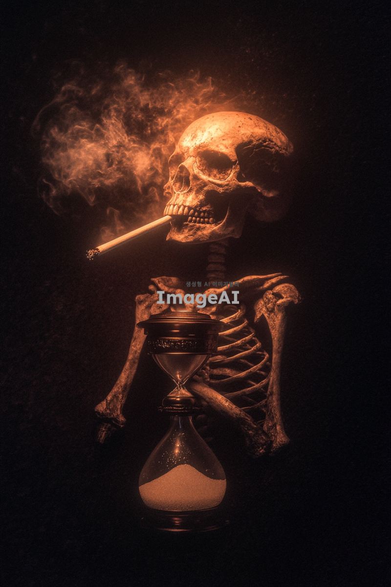 해골이 담배를 피우며 오른쪽 팔뚝을 모래시계에 올리고 있는 장면, 모래시계 안에는 담배 연기가 가득 차 있는 모습, 배경은 어두운 분위기의 실내, 해골의 디테일이 강조되고 담배 연기가 부드럽게 퍼지는 장면, 전체적인 색감은 모노톤으로 설정, 분위기는 약간의 신비로움을 더하여 표현.