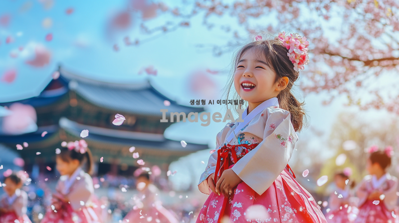 경복궁의 아름다운 전경 속에서 전통 한복을 입고 즐겁게 뛰노는 아이들, 따스한 봄 햇살이 비추는 푸른 하늘과 만개한 벚꽃 나무들, 아이들의 환한 웃음소리와 함께 전통 건축물의 정교한 디테일이 어우러진 장면, 부드러운 바람에 살랑이는 꽃잎들과 생기 넘치는 봄날의 분위기.