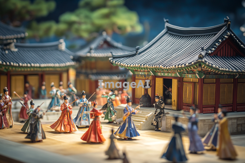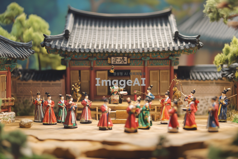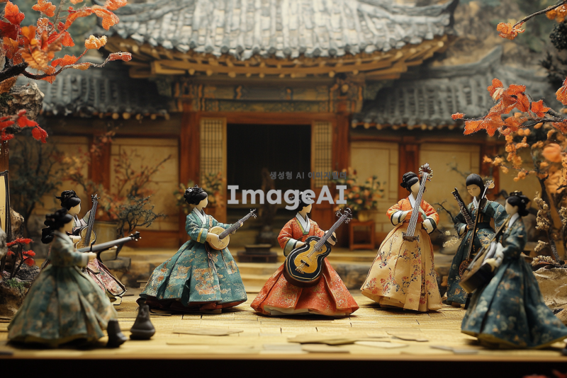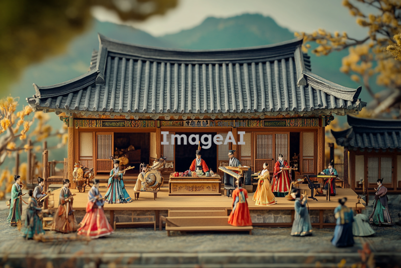 전통 한옥 건축 양식을 배경으로 한 대한민국의 궁궐, 조선 시대의 화려한 궁중 의상을 입은 인물들이 전통 악기를 연주하고 있는 장면, 궁궐의 웅장함과 고유의 아름다움을 강조하는 화려한 색채와 디테일, 전통 문양과 조화롭게 어우러지는 한국적 미학, 현대적인 감각으로 재해석된 전통 문화 요소들이 조화를 이루는 모습, 문화유산의 가치와 아름다움을 전달할 수 있는 장면.