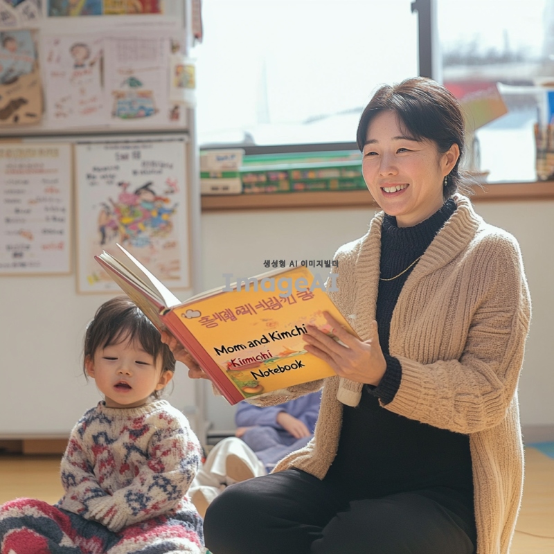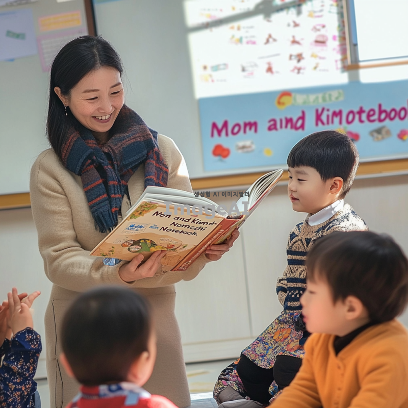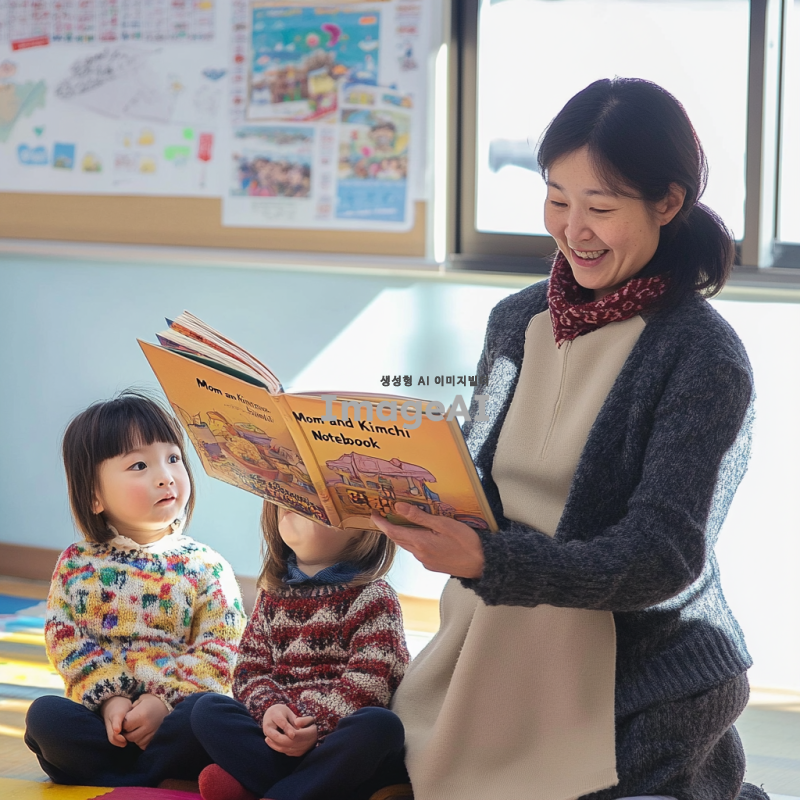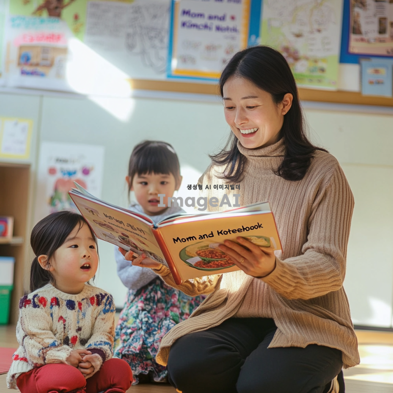 밝고 아늑한 유치원 교실, 바닥에 앉아 있는 유치원생 3명, 웃고 있는 모습, 책을 들고 있지 않음, 따뜻한 미소를 짓고 있는 교사가 아이들 앞에서 <엄마와 김치수첩> 책을 읽어주는 장면, 교실 벽에 알록달록한 그림과 장식, 창문으로 부드럽게 들어오는 햇살, 다양한 표정을 짓고 있는 아이들, 책의 내용에 집중하고 있는 모습, 교사의 옷은 밝고 친근한 색상, 아이들의 옷은 다양한 색상과 패턴