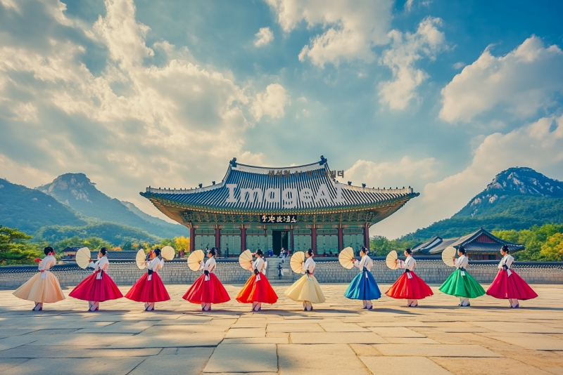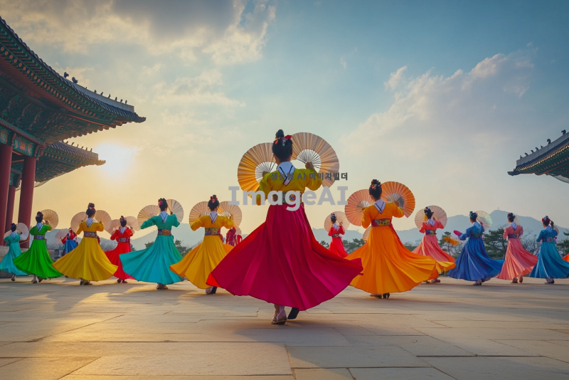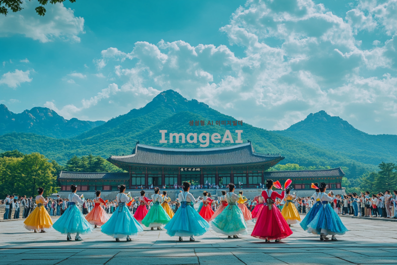 경복궁의 아름다운 전경을 배경으로 한국 전통 춤을 추는 무용수들이 화려한 한복을 입고 춤을 추고 있는 모습. 무용수들은 우아한 동작과 함께 부채나 소품을 활용하며, 주변에는 전통 악기를 연주하는 연주자들이 함께 있어 전통 음악이 흐르는 분위기. 경복궁의 고풍스러운 건축물과 정원의 자연이 어우러져 시공간을 초월한 듯한 신비로운 분위기를 연출.