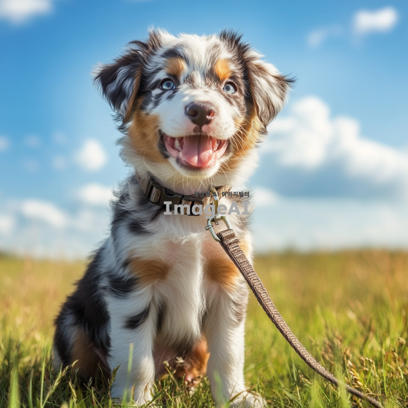 귀여운 강아지, 부드러운 털과 반짝이는 눈, 무거운 쇠 목줄을 하고 있음, 따뜻한 햇살 아래 잔디밭에 앉아 있는 모습, 배경은 푸른 하늘과 흰 구름, 강아지의 표정은 행복하고 호기심 가득한 느낌.
