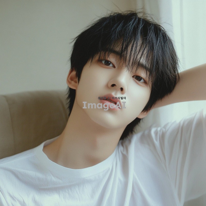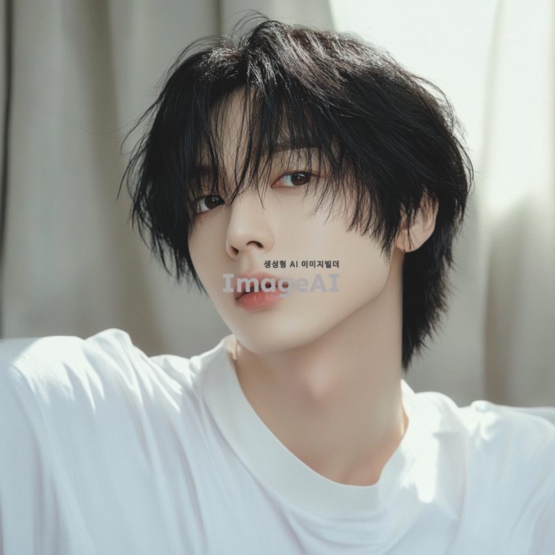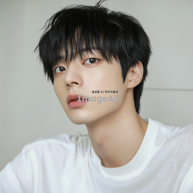 검은 머리를 가진 아시아 남자 모델의 사진으로 흰 셔츠를 입고 있습니다. 얼굴은 약간 옆으로 돌려져 있으며, 그의 눈과 입술이 보입니다. 짧고 직선적인 머리에 이마에 앞머리가 내려와 있으며, 웨이브나 땋은 머리는 없습니다. 한국 K-pop 아이돌 스타일입니다. 고해상도, 자연광, 섬세한 디테일, 전문적인 사진입니다. 검은색 뿔테안경을 쓰고 있습니다.