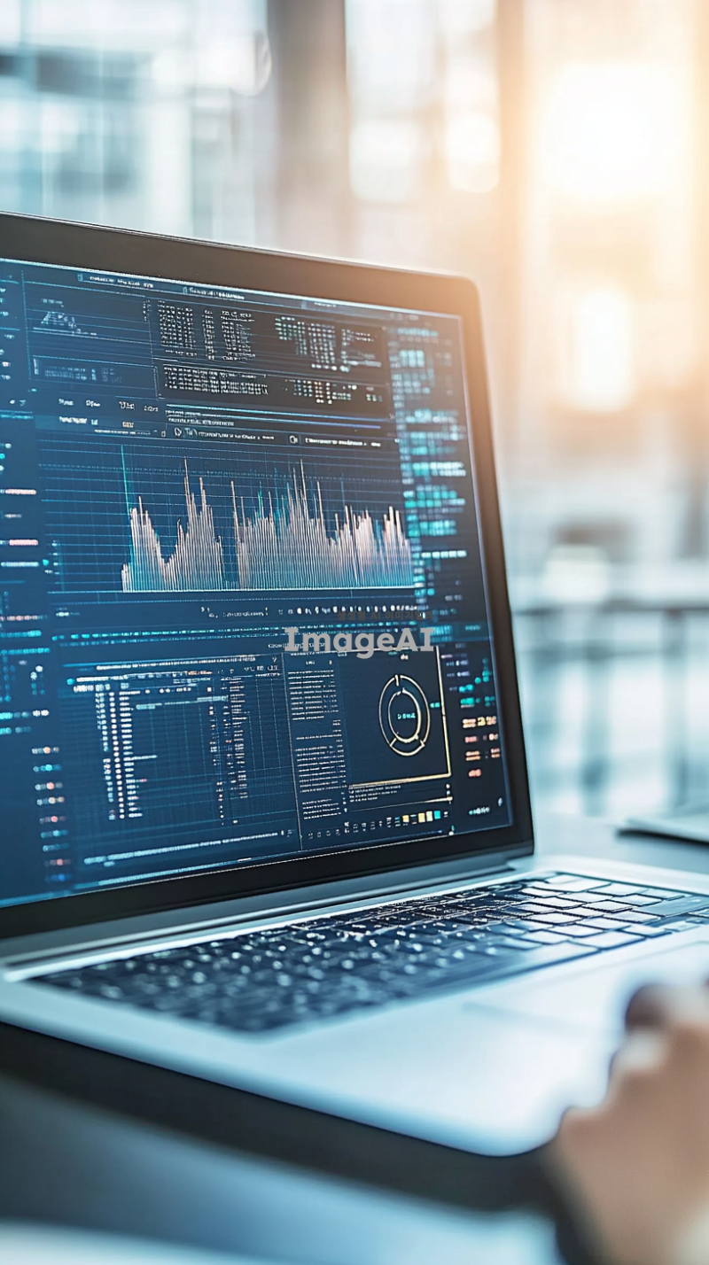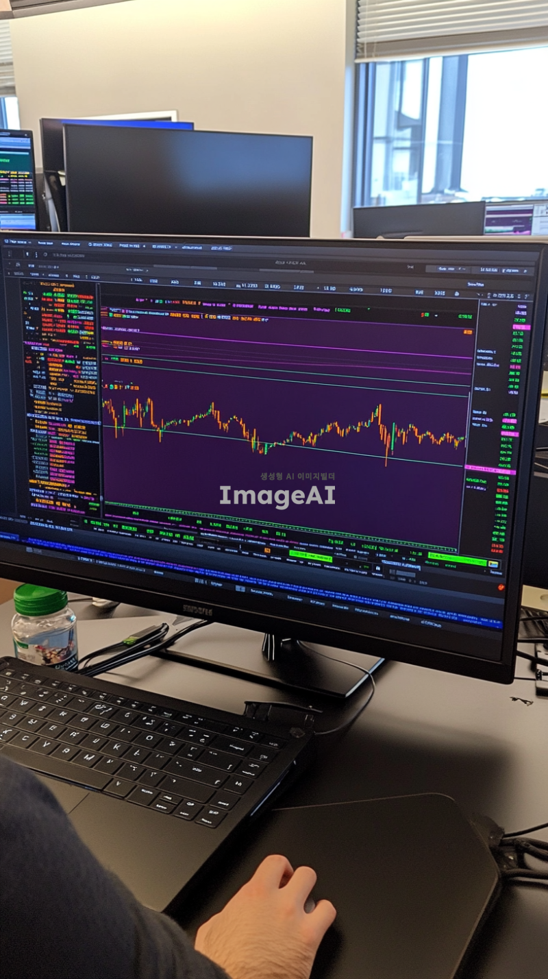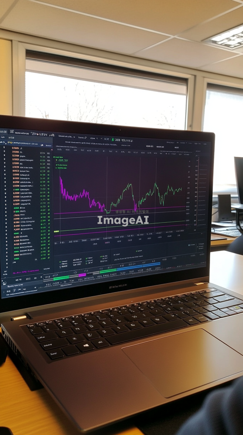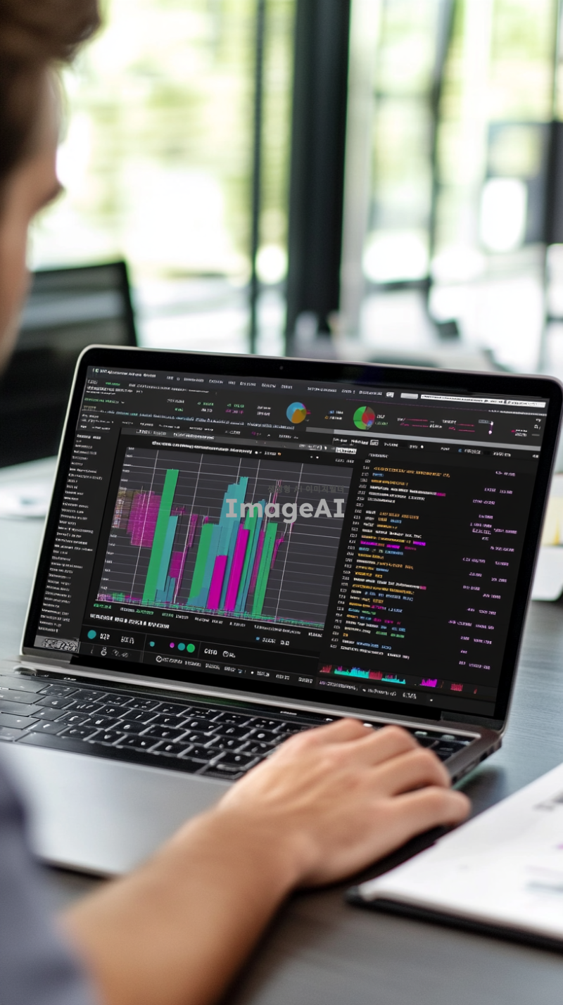 넓은 책상 위에 놓인 큰 노트북 화면에 코인 차트가 펼쳐져 있고, 차트의 세부사항이 선명하게 보이는 장면. 화면에는 다양한 색상의 그래프와 숫자가 복잡하게 표시되어 있으며, 차트의 움직임이 역동적으로 표현됨. 노트북 앞에 앉은 사람은 뒷모습으로, 차트에 집중하고 있는 모습. 주변에는 차분한 사무실 환경이 배경으로 배치되어 있음.