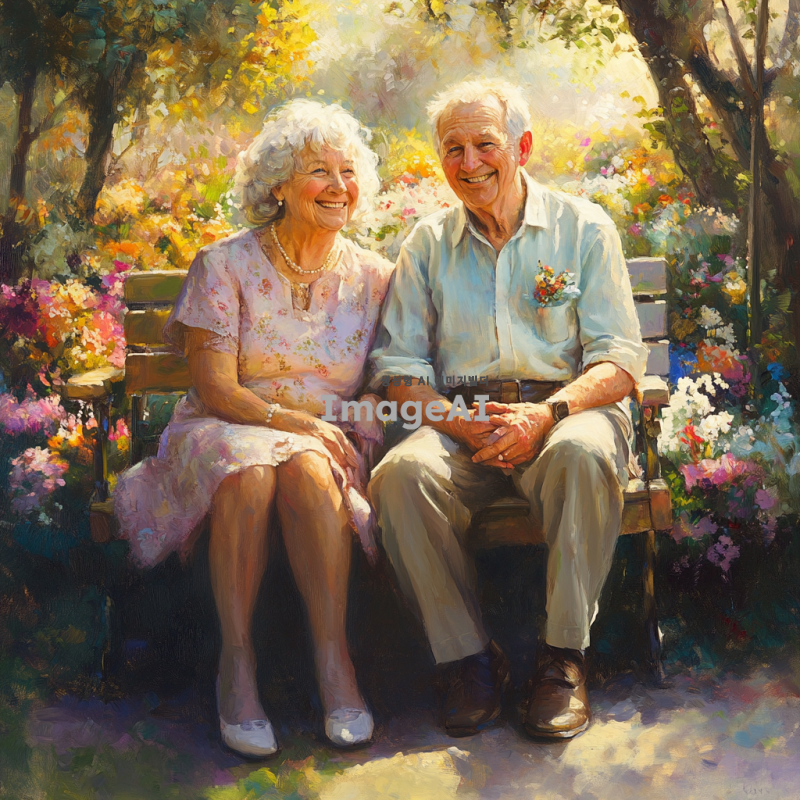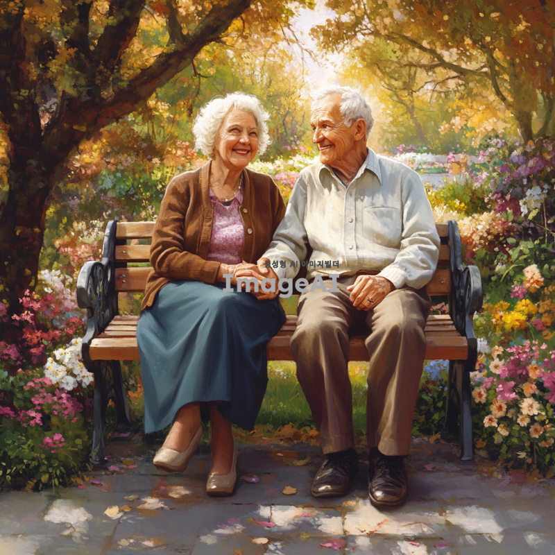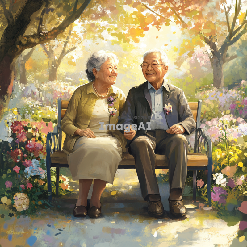 노부부가 함께 웃으며 공원 벤치에 앉아 있는 모습, 주변에는 꽃과 나무가 가득하고 따뜻한 햇살이 비치는 장면, 노부부는 서로 손을 잡고 있으며 편안하고 행복한 표정을 짓고 있음, 부드러운 파스텔 톤의 색감과 자연스러운 분위기, 노부부의 옷차림은 깔끔하고 단정한 캐주얼 스타일