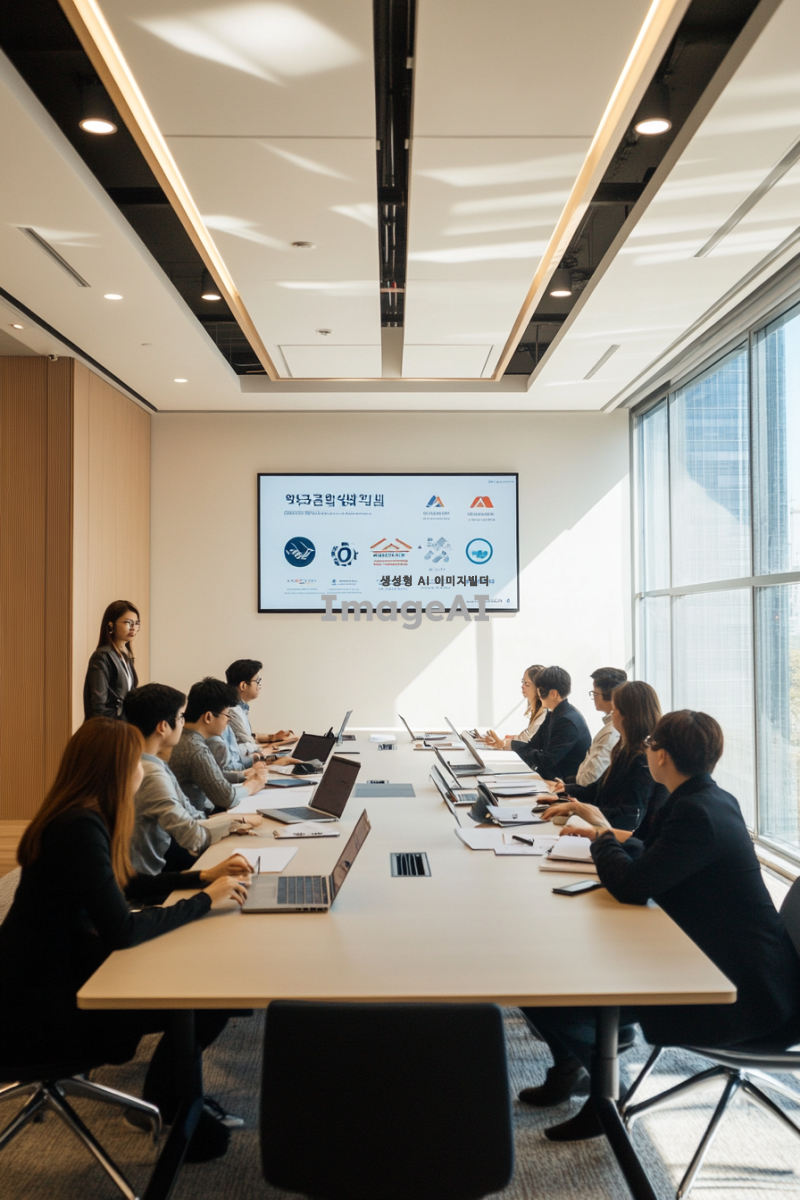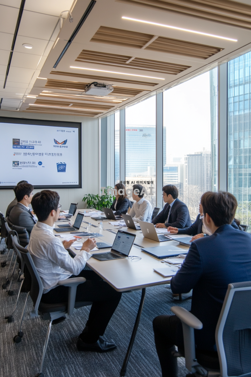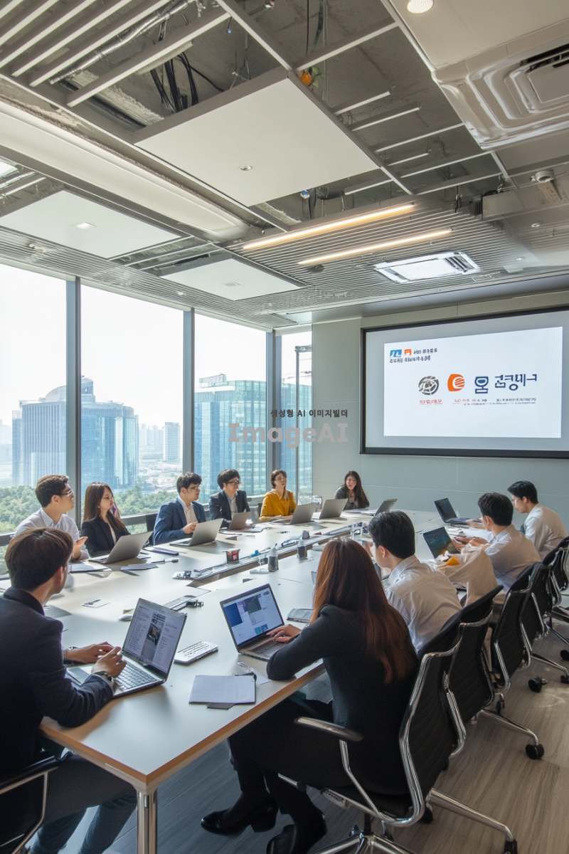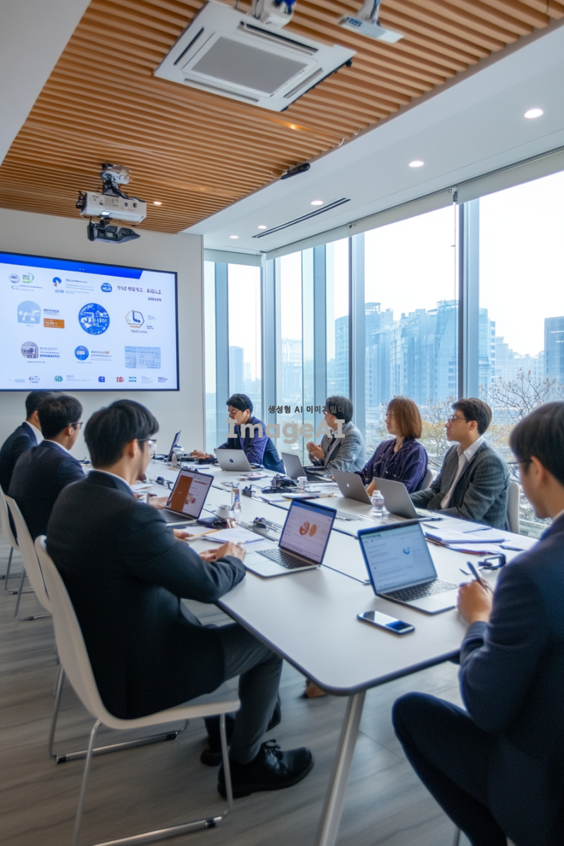 현대적인 사무실 회의실, 긴 테이블 주위에 여러 명의 한국인 비즈니스 전문가들이 앉아 있음, 테이블 위에는 노트북과 서류들이 놓여 있으며, 벽에는 프레젠테이션 화면이 켜져 있음, 화면에는 다양한 업체의 로고와 정보가 표시되어 있음, 참석자들은 진지한 표정으로 토론 중이며, 몇몇은 메모를 하고 있음, 창문을 통해 자연광이 들어오는 밝고 깔끔한 분위기, 전문적이고 협력적인 분위기 강조.