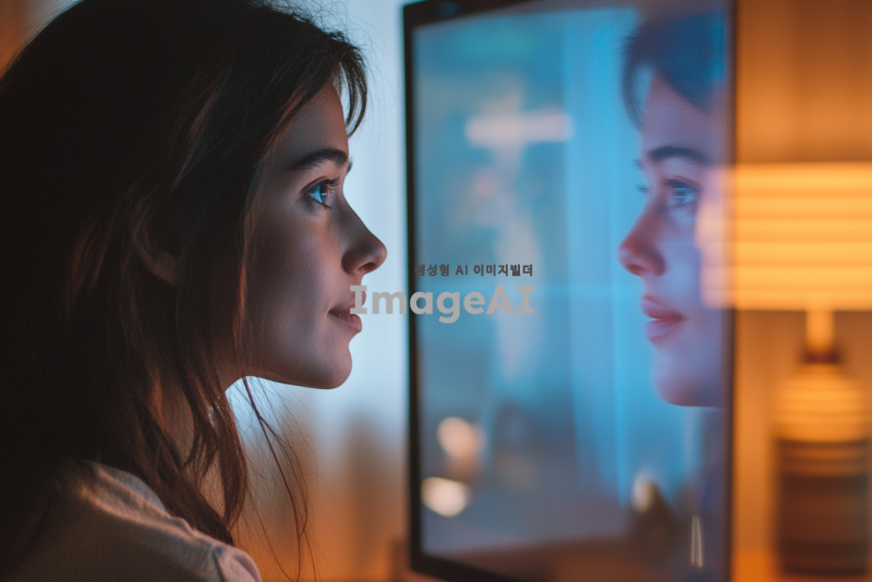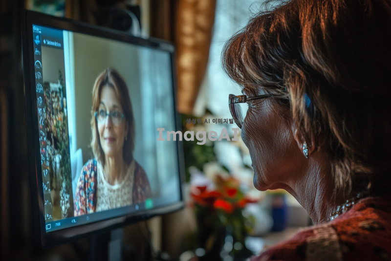 집에서 비대면 회의를 하는 여성이 화면으로 자신의 얼굴만 보고 있는 장면을 화면에 비춰지는 여성의 모습이 나오게