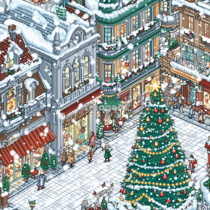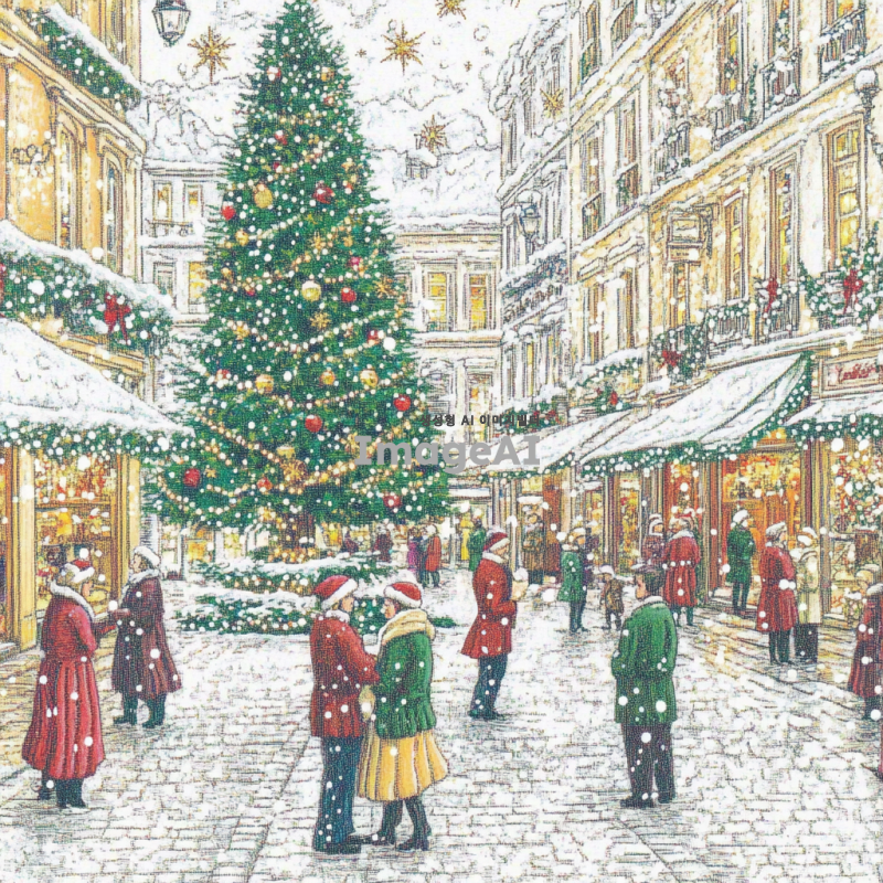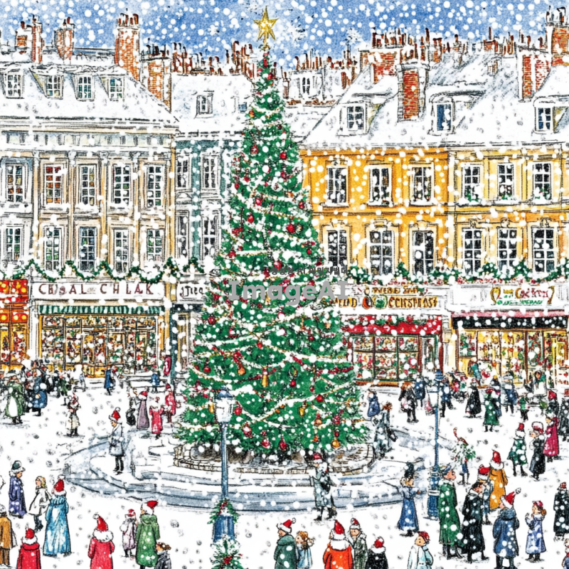 크리스마스 장식으로 화려하게 꾸며진 광장, 눈이 펑펑 쏟아지는 겨울 풍경, 반짝이는 크리스마스 트리와 다양한 색상의 전구들, 따뜻한 분위기의 사람들, 모두가 즐겁게 웃으며 산타 모자와 목도리를 두른 모습, 주변에 눈으로 덮인 나무들과 크리스마스 장식이 가득한 상점들, 부드럽게 내리는 눈송이들이 광장 전체를 덮고 있는 장면.