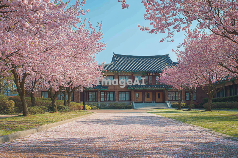 한국의 전통적인 학교 건물을 배경으로, 벚꽃잎이 바람에 날리는 장면. 밝고 환영하는 분위기의 입학식 날을 표현하며, 맑은 하늘 아래에 따뜻한 햇살이 비추는 모습. 학교 앞에는 다양한 크기의 나무들이 서 있고, 벚꽃이 만개하여 화사한 느낌을 준다.
