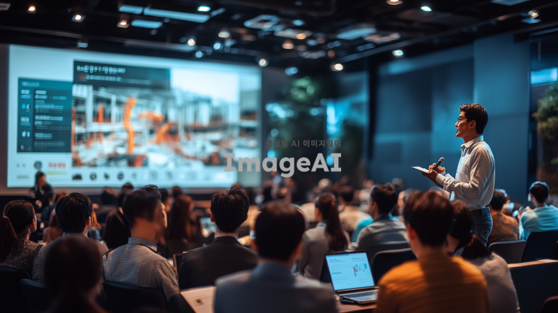 현대적인 대형 강당에서 여러 사람들이 모여 있는 모습, 무대 위에서 건설 관련 강연을 진행하는 전문가, 청중은 다양한 연령대의 한국인, 강연자는 마이크를 들고 있으며 배경에는 건설 프로젝트와 관련된 이미지나 슬라이드가 보임, 청중은 집중하여 강연을 듣고 있으며 노트북이나 노트를 사용하여 메모하는 모습, 실내 조명은 밝고 따뜻한 분위기, 강연의 전문성과 열정이 느껴지는 장면.
