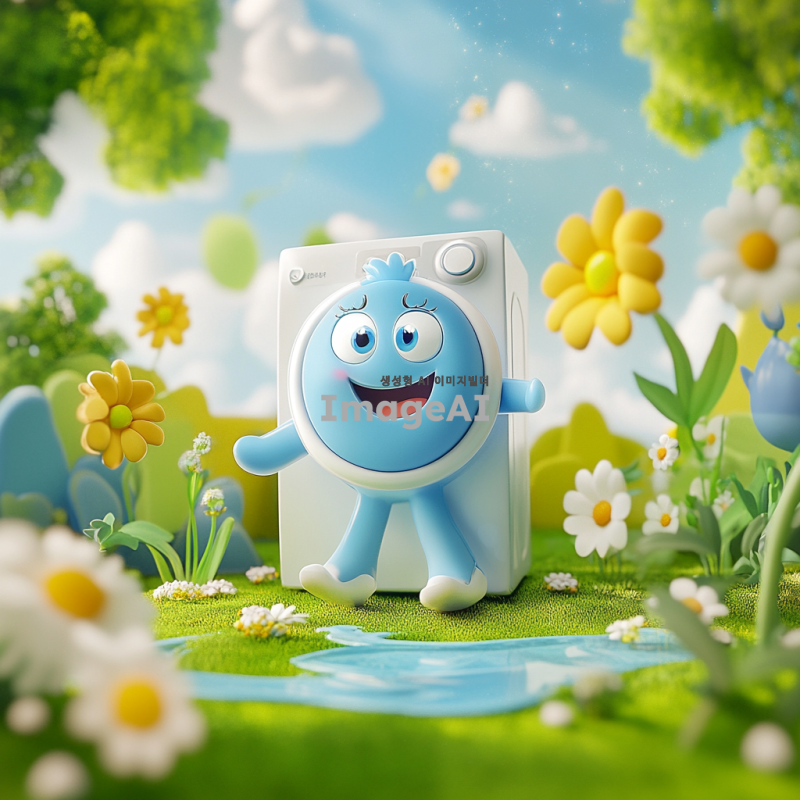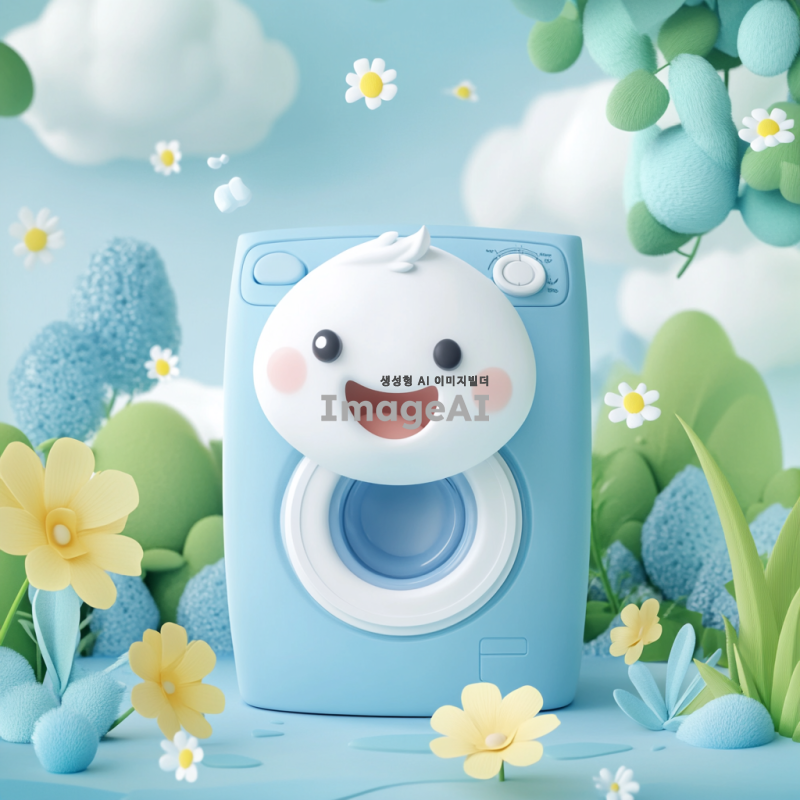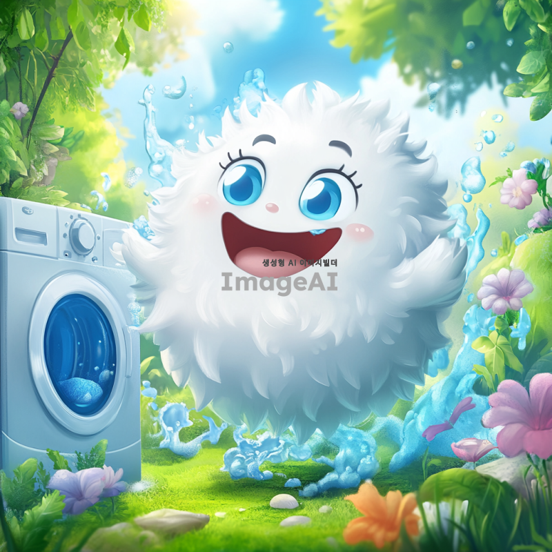 밝고 친근한 느낌의 세탁세제 캐릭터, 깨끗하고 상쾌한 이미지를 강조, 밝은 미소와 반짝이는 눈을 가진 귀여운 캐릭터, 세탁기나 빨래와 함께 있는 장면, 파란색과 흰색을 주요 색상으로 사용, 자연 속에서 상쾌한 바람을 맞으며 웃고 있는 모습, 친환경적인 이미지를 강조, 주변에 꽃이나 나무가 있는 배경, 부드럽고 둥근 형태의 디자인