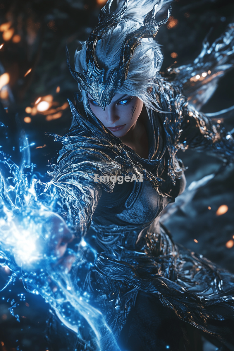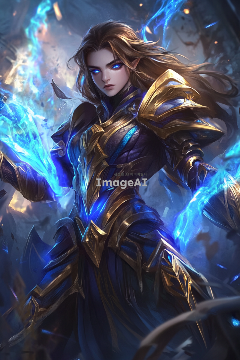판타지 스타일의 전투 장면에서 강력한 전사로 변신한 카이사, 그녀는 화려한 갑옷을 입고 있으며, 주변에는 푸른 에너지가 감돌고 있다. 배경은 어두운 숲 속으로, 카이사가 빛을 발하며 적들과 대치하고 있는 모습. 카이사의 표정은 결의에 차 있으며, 그녀의 손에는 빛나는 무기가 들려 있다. 전체적으로 역동적이고 긴장감 넘치는 분위기를 강조.