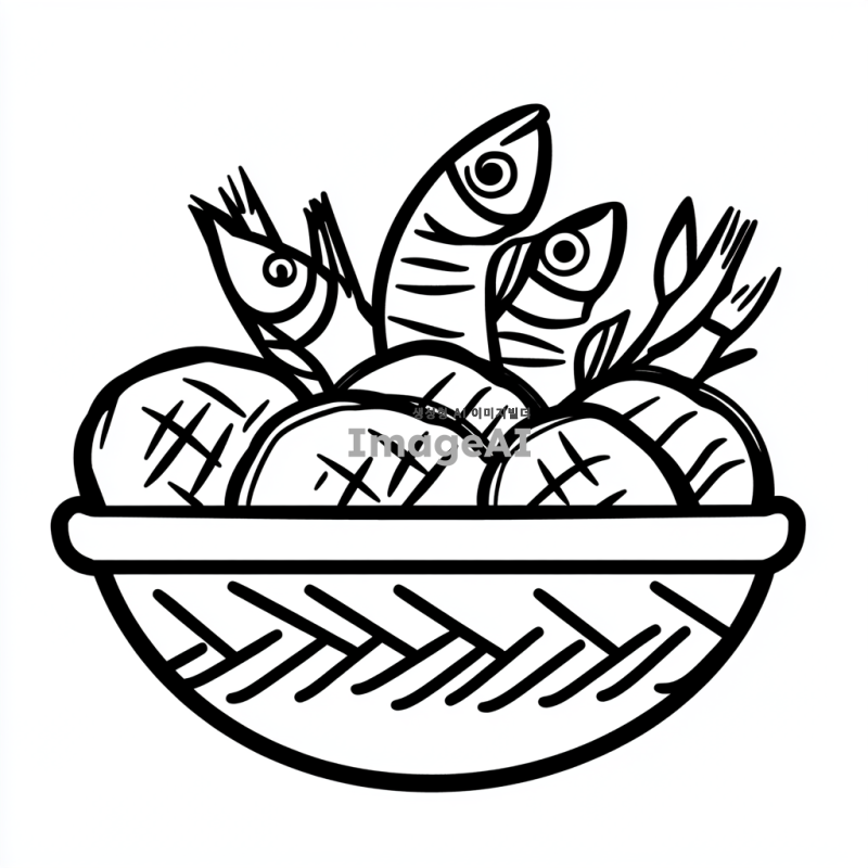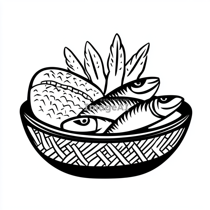 짚으로 엮은 광주리 안에 구운 생선 두 마리와 빵 다섯 덩이가 담긴 심플한 로고 형태의 흑백 라인 아트 이미지, 한국 전통 느낌.