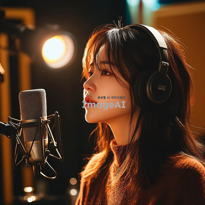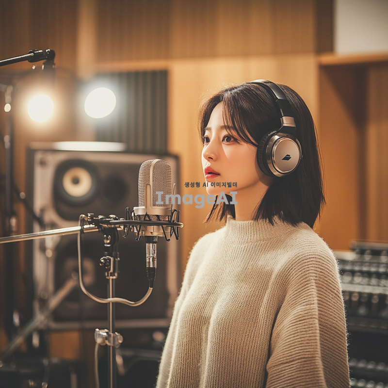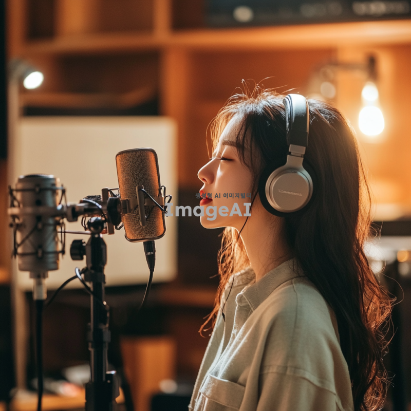 한국 여성, 학원 스튜디오에서 녹음 중, 헤드폰을 착용하고 마이크 앞에 서 있는 모습, 집중한 표정, 주변에 다양한 녹음 장비와 음향 패널, 따뜻한 조명, 현대적인 스튜디오 인테리어, 음악적 분위기.