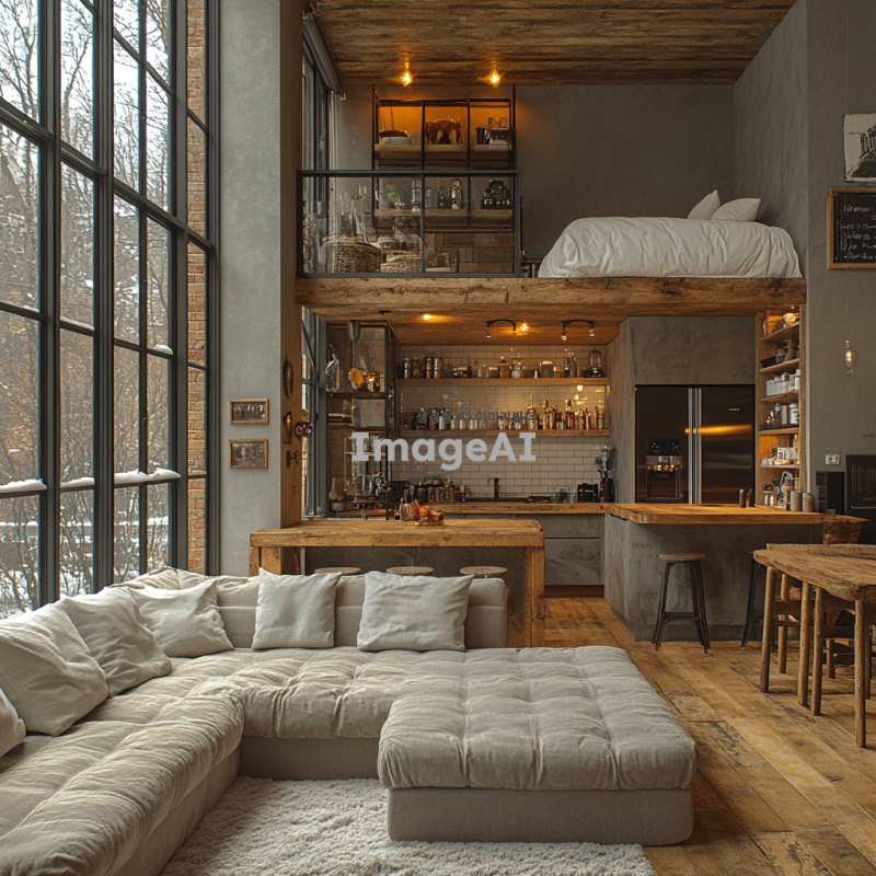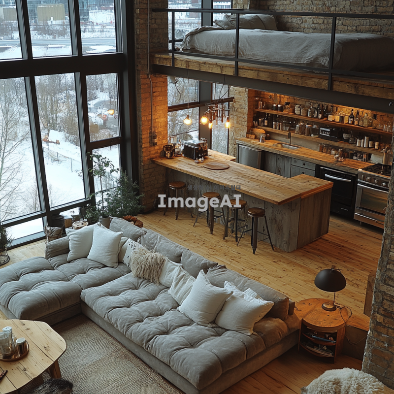 회색 톤의 개방형 거실과 주방 사진으로, 현대 산업 스타일입니다. 공간은 나무 바닥, 흰색 베개가 있는 아늑한 소파, 왼쪽에 시골풍의 나무 테이블, 오른쪽 구석에 바 카운터, 부드러운 회색 패브릭 커버링이 있는 더블 침대를 특징으로 합니다. 큰 창문에서 들어오는 자연광과 따뜻한 조명이 방을 채우며, 항공 뷰를 제공합니다. 밖은 눈이 내리고 있으며 실내에는 밖과 대조되게 따뜻한 느낌을 줍니다