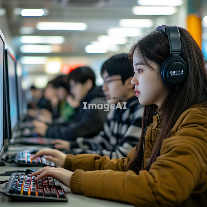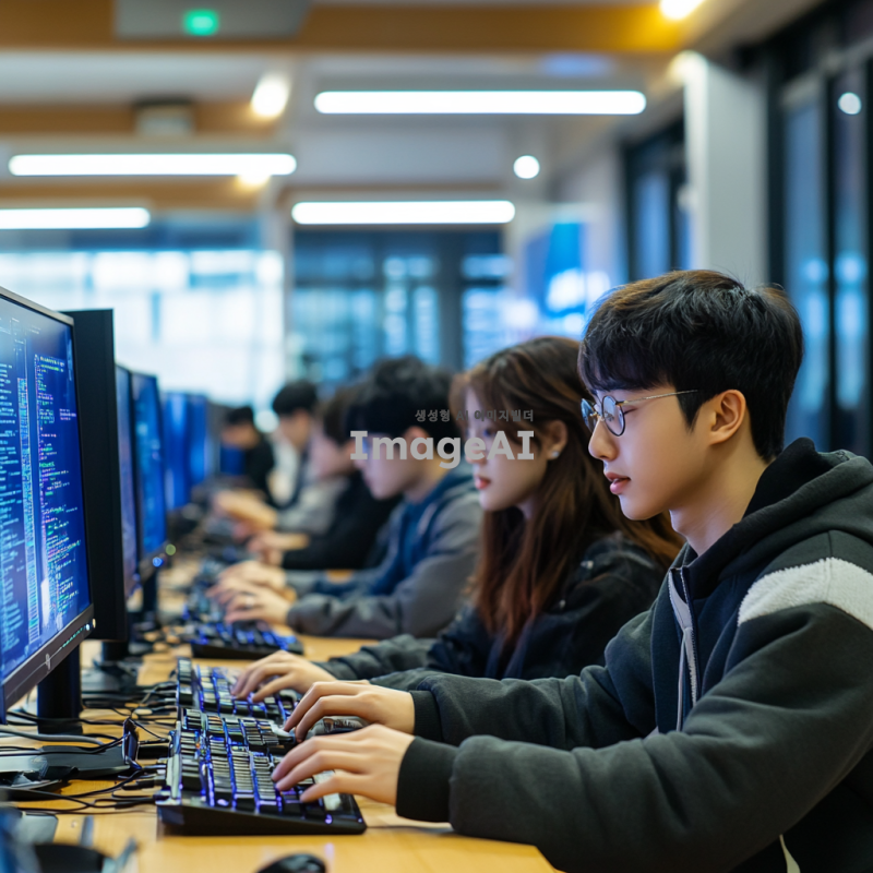 현대적인 교실에서 가상 키보드를 사용하여 해킹 기술을 배우는 학생들, 학생들은 집중하여 컴퓨터 화면을 바라보며 가상 키보드를 사용하고 있고, 주변에는 첨단 기술 장비와 디지털 화면이 가득한 모습, 학생들은 다양한 연령대의 한국인으로 구성되어 있으며, 각자의 스타일로 편안한 옷을 입고 있음, 교실은 밝고 미래지향적인 분위기를 가지고 있음.