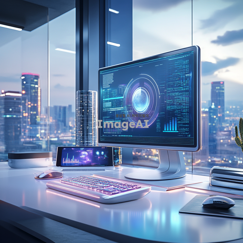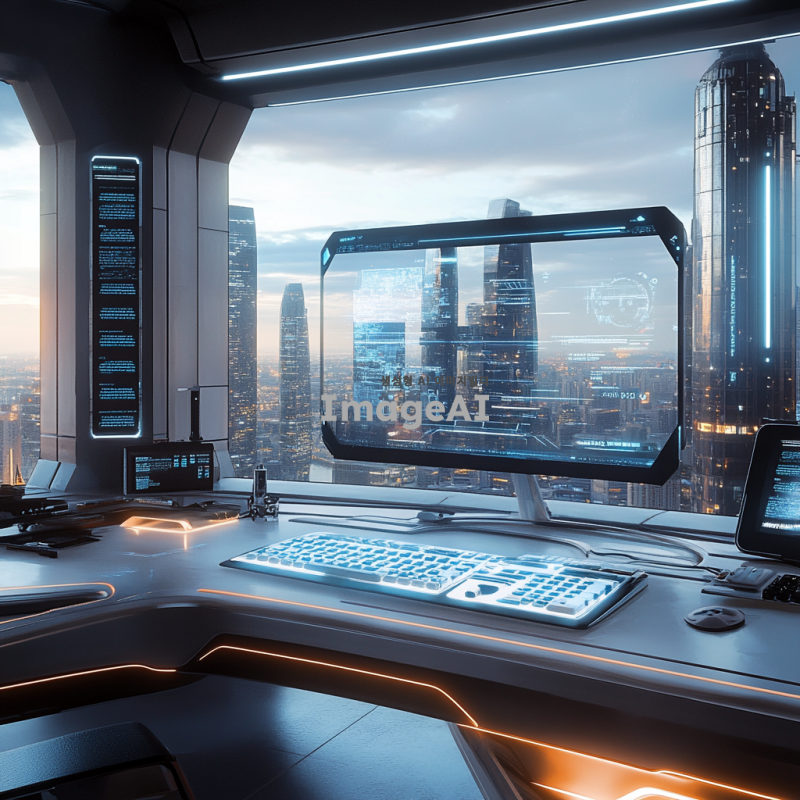 미래적인 사무실 환경, 홀로그램 모니터와 홀로그램 키보드가 중앙에 배치된 장면, 주변은 현대적이고 깔끔한 디자인, 모니터와 키보드에서 빛이 은은하게 퍼져 나오는 모습, 기술의 발전을 강조하는 디테일, 차분한 색조의 배경, 창문을 통해 도시의 야경이 보이는 설정.