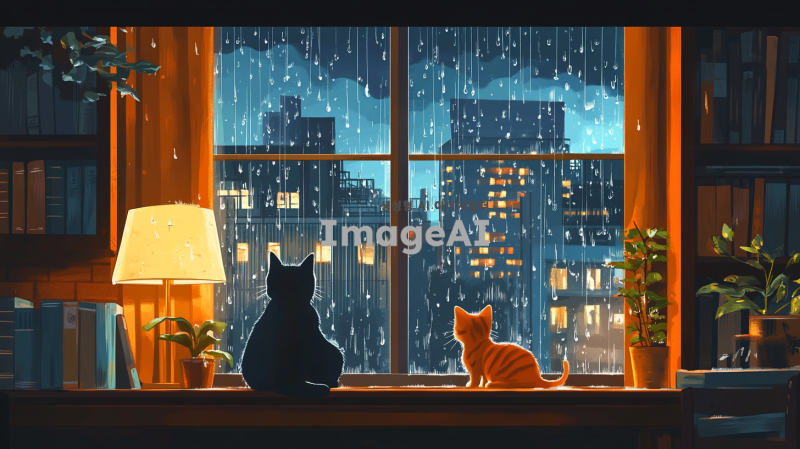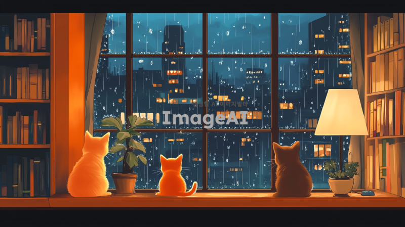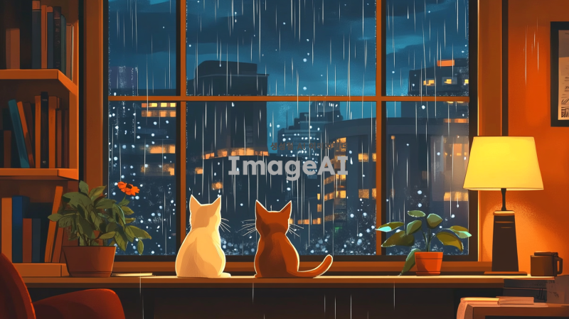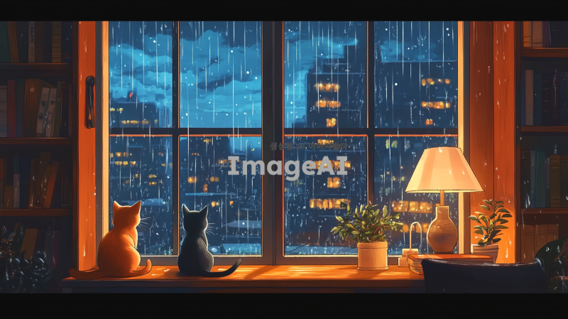 비 오는 날 창 밖을 바라보는 한마리 고양이, 한마리 작은강아지의 아늑한 풍경을 그려주세요. 고양이와 강아지들은 창문 앞에 앉아 있고, 창 밖으로는 빗방울이 떨어지는 도시의 야경이 보입니다. 실내에는 책장이 있고, 여러 권의 책이 정리되어 있으며, 책상 위에는 스탠드 조명과 화분이 있습니다. 전체적인 분위기는 따뜻하고 포근하며, 비 오는 날의 고요함과 평온함을 잘 표현해주세요