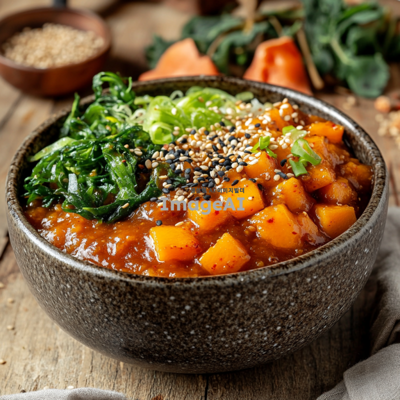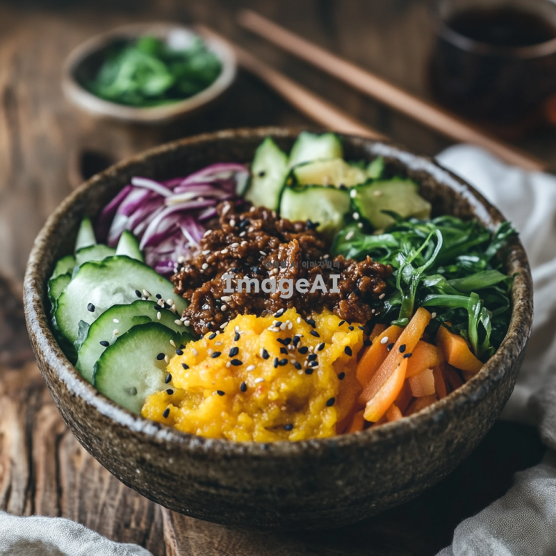 깊고 풍부한 밤호박 색감의 비빔밥 밀키트 이미지, 한국 전통의 도자기 그릇에 담긴 비빔밥, 으깬 밤호박과 된장이 어우러진 소스가 비빔밥 위에 골고루 뿌려져 있는 모습, 신선한 채소와 함께 다양한 색상의 나물들이 조화롭게 배치된 비빔밥, 따뜻한 느낌의 자연광 아래에서 촬영된 이미지, 전통적인 한국 식탁 분위기를 강조하는 배경.