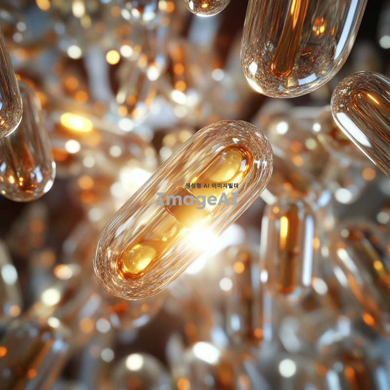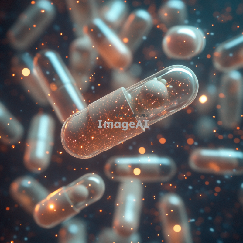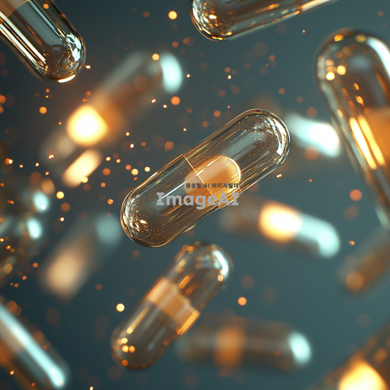 깨끗하고 현대적인 디자인의 캡슐과 정제 이미지, 다양한 크기와 색상의 캡슐과 정제, 빛을 받아 반짝이는 모습, 고해상도, 세밀한 디테일, 약학적 느낌을 강조