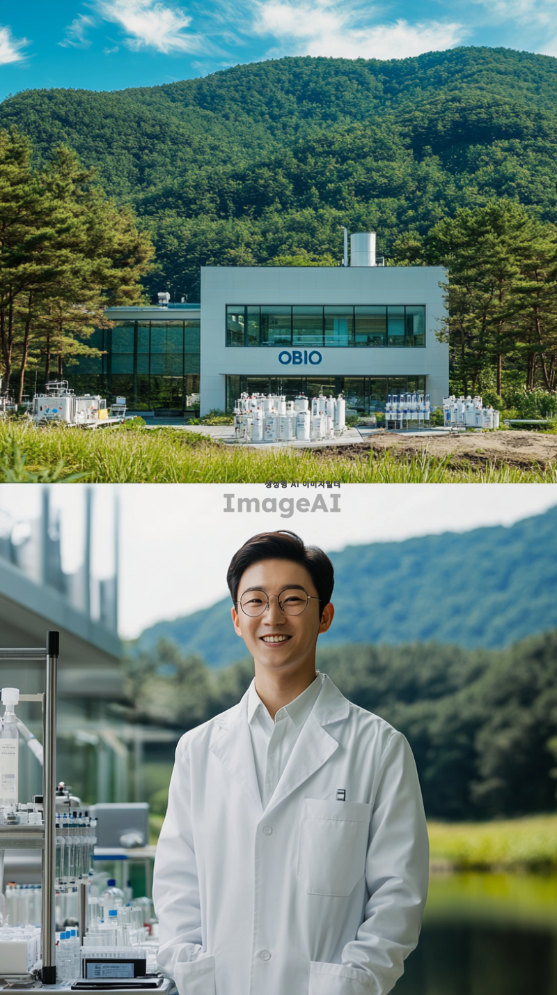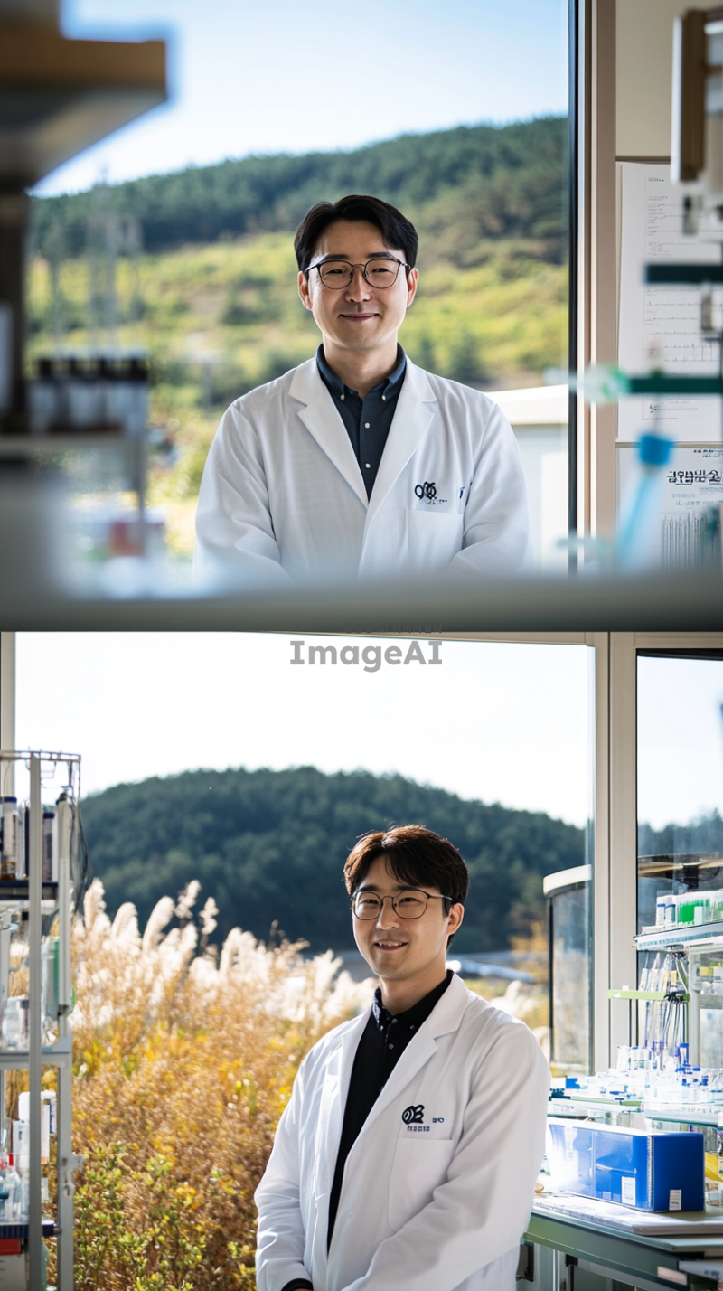 - 연구소 앞에 서 있는 한국인 과학자, 흰색 실험복을 입고 미소를 지으며 자연을 배경으로 서 있는 모습
