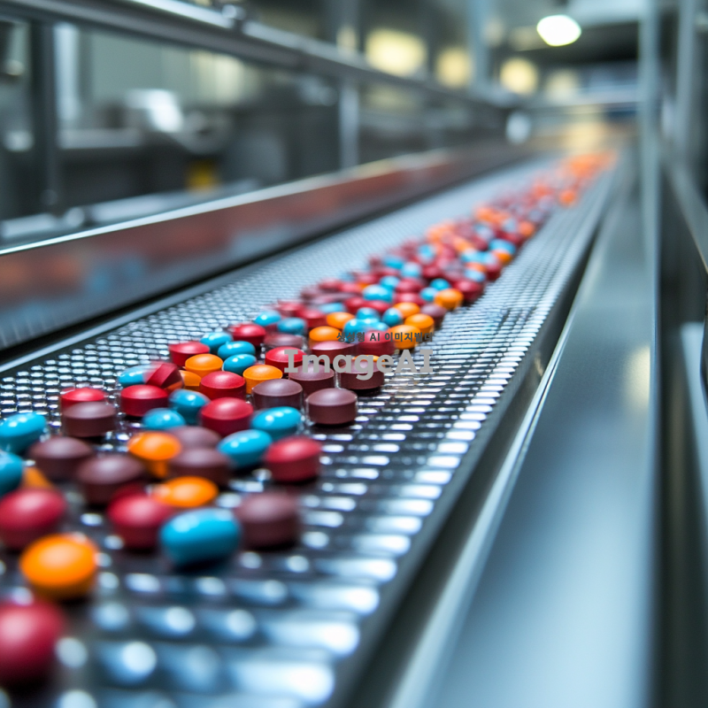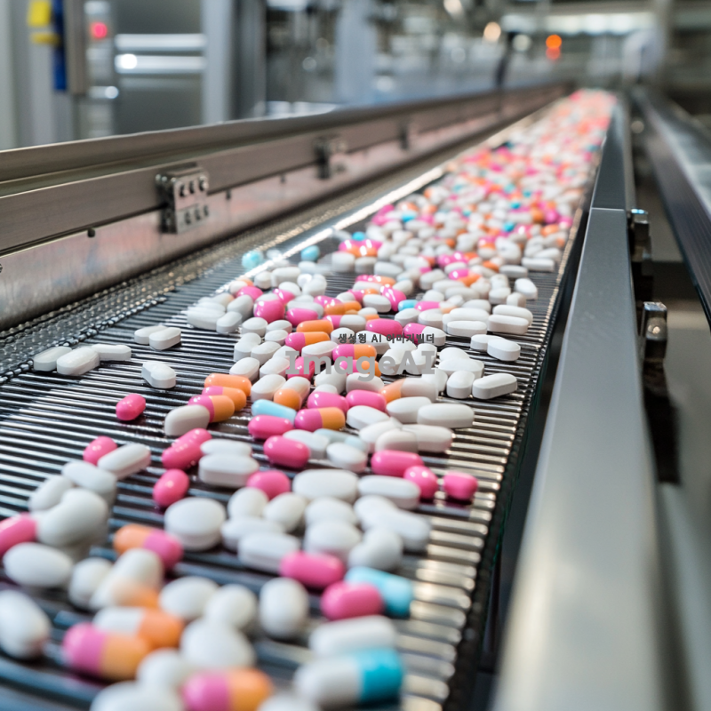 태블릿과 캡슐을 검사하는 공정에 관한 사진, 사람은 없음, 알약이나 캡슐약 자체에 대한 사진도 포함, 너무 척박한 컨베이어 벨트 모양은 아닌 현대적인 장비 사용