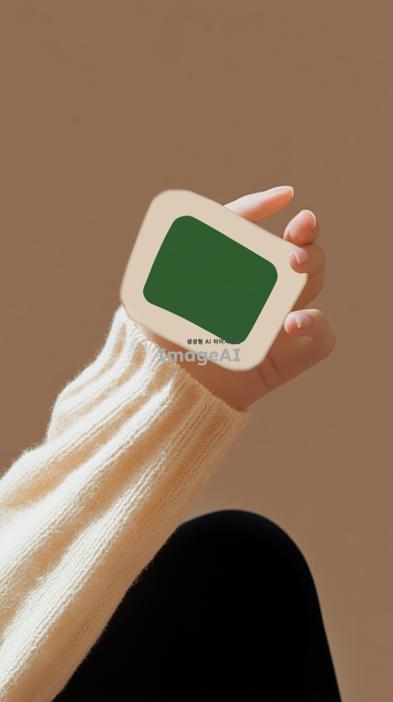 스튜디오 사진관 배경, 블로그 아이콘 모양을 손으로 들고 있는 한국인, 목부터 다리 중반부까지의 모습, 차분한 조명과 깔끔한 배경 설정.