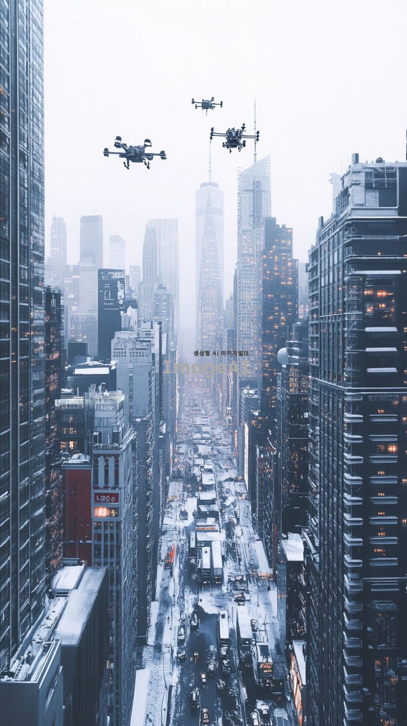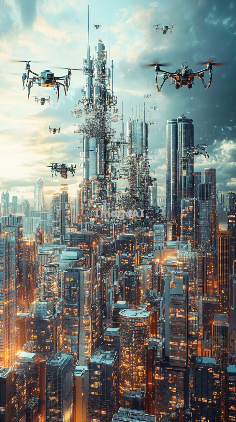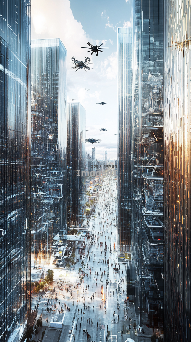 미래지향적인 기계공학적 요소가 돋보이는 도시 풍경, 고층 빌딩 사이로 복잡한 기계 구조물이 보이고, 하늘에는 드론이 날아다니며, 바닥에는 자동화된 로봇들이 움직이고 있는 모습, 전체적인 색조는 차가운 메탈릭 톤, 현대적인 디자인과 정교한 디테일 강조.
