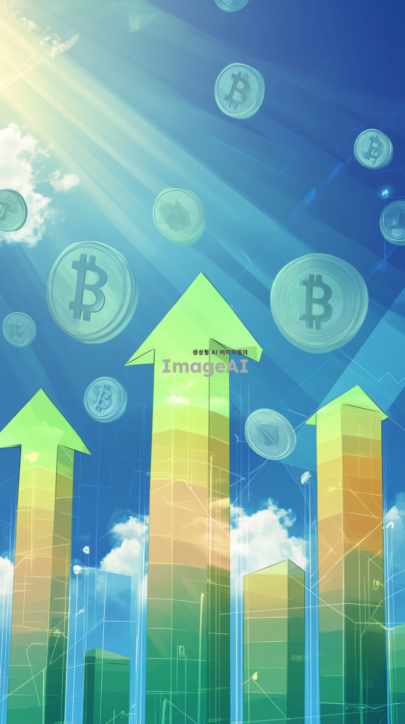 밝고 희망적인 분위기의 코인 차트, 차트가 끝없이 상승하며 하늘을 향해 치솟는 모습, 배경에는 커다란 녹색 화살표들이 상승하는 느낌을 강조하며 나타남, 차트의 선은 선명하고 굵게, 차트의 배경은 깨끗한 하늘색으로 설정, 차트는 디지털 스타일로 현대적이고 세련되게 표현, 주변에는 코인과 관련된 아이콘들이 부드럽게 배치되어 있으며, 전체적인 분위기는 긍정적이고 활기찬 느낌을 주도록 구성.