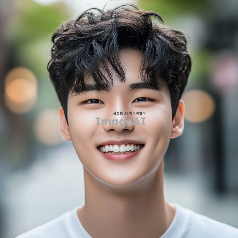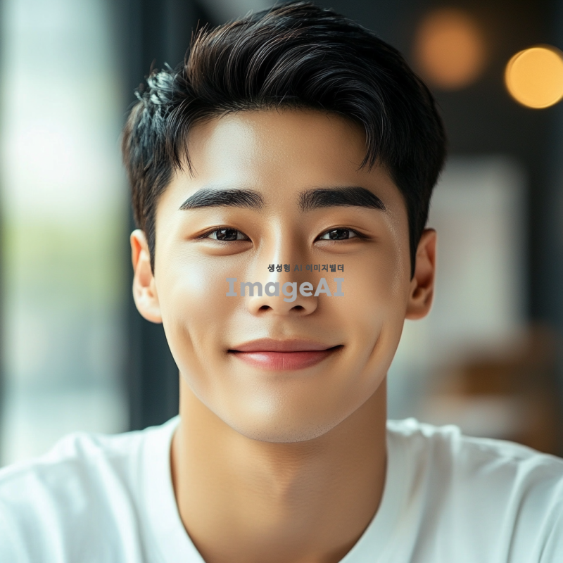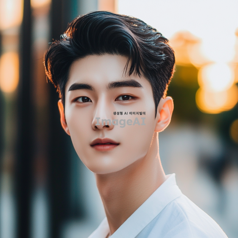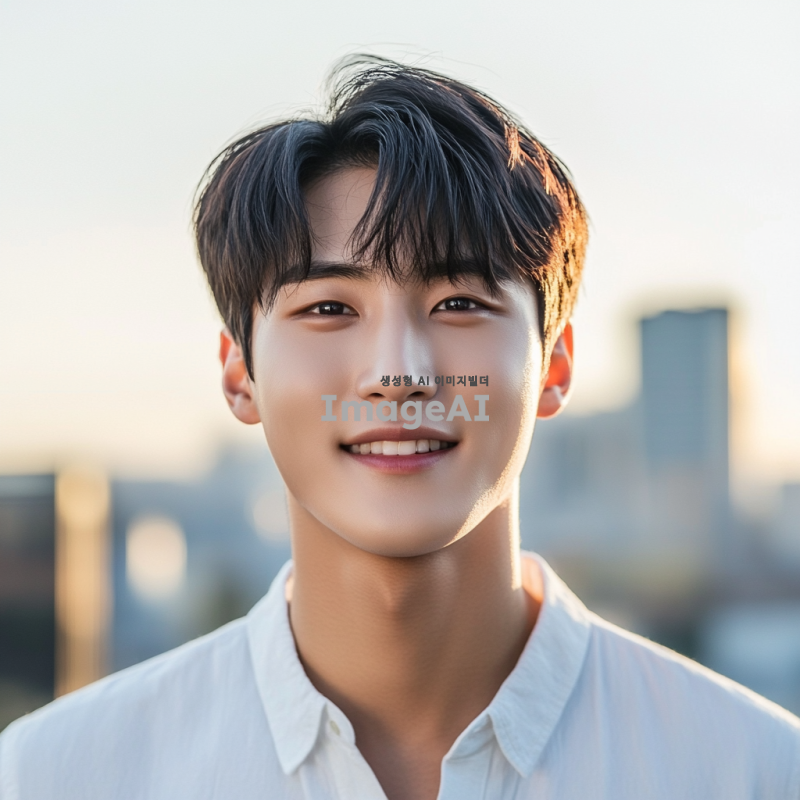 잘생긴 20살 한국인 남자, 짧은 검은 머리, 깨끗한 피부, 깊은 눈매, 날카로운 턱선, 캐주얼한 흰 셔츠, 자연스러운 미소, 현대적인 도시 배경, 부드러운 조명, 따뜻하고 친근한 분위기.