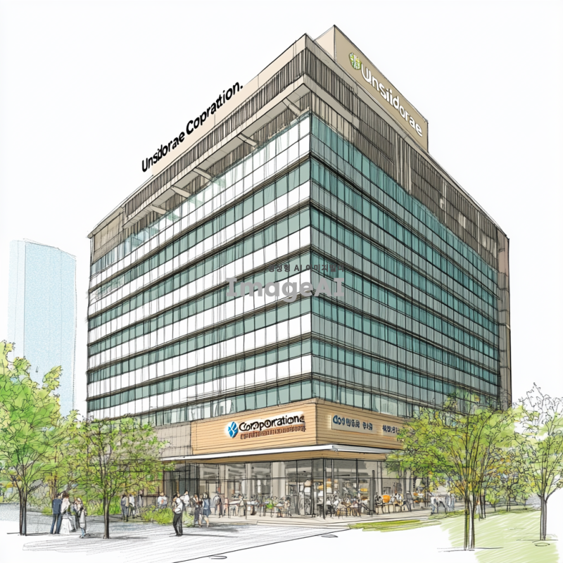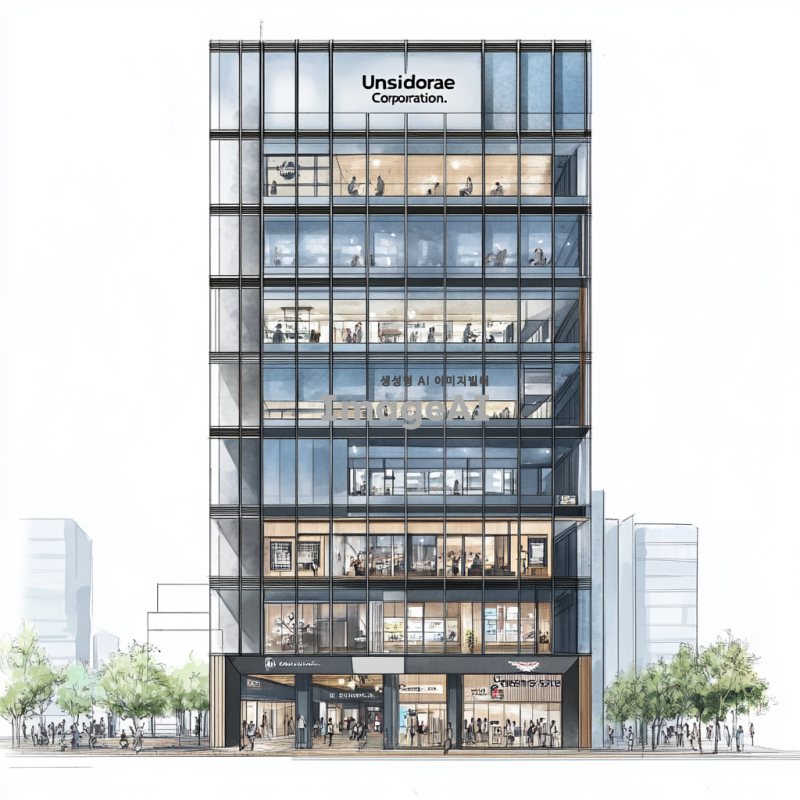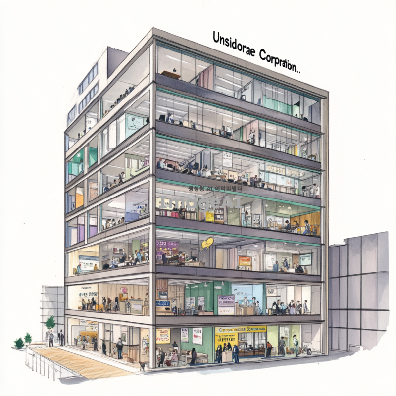 20층 건물의 전체적인 외관을 보여주는 그림. 건물 상단 20층에는 "운시도래 주식회사" 간판이 크게 걸려 있다. 17~19층은 공유오피스로, 창문에 공유오피스 느낌의 로고나 문구가 보인다. 15~16층은 일반 사무실로, 깔끔하고 정돈된 외관을 가진다. 13~14층은 고등학교 입시학원, 11~12층은 중학교 학원, 9~10층은 초등학교 학원으로, 각 층마다 학원의 특징적인 간판이 걸려 있다. 6~8층은 병원으로, 의료 관련 아이콘이나 십자가가 보인다. 5층은 브런치 카페로, 아늑하고 따뜻한 느낌의 간판이 있다. 4층은 식당가로, 다양한 음식점의 간판이 걸려 있다. 3층은 네일샵과 미용실 등의 뷰티 관련 상점들로, 화려하고 세련된 간판이 돋보인다. 2층은 은행으로, 안정적이고 신뢰감 있는 간판이 있다. 1층에는 스타벅스, 김밥집, 편의점이 위치해 있으며, 각 브랜드의 로고가 선명하게 보인다. 지하에는 줄넘기 학원과 스포츠 클라이밍 시설이 있으며, 운동 관련 이미지를 통해 활기찬 분위기를 연출한다. 건물 주변에는 사람들이 오가는 모습이 자연스럽게 그려져 있다.