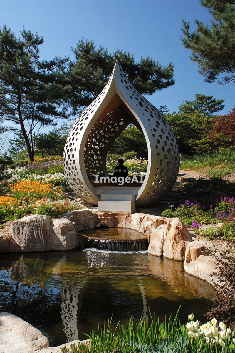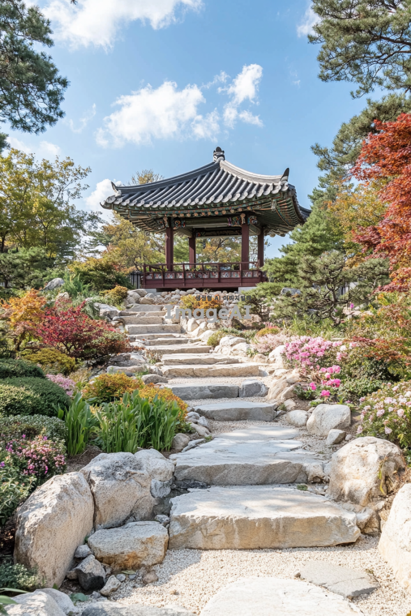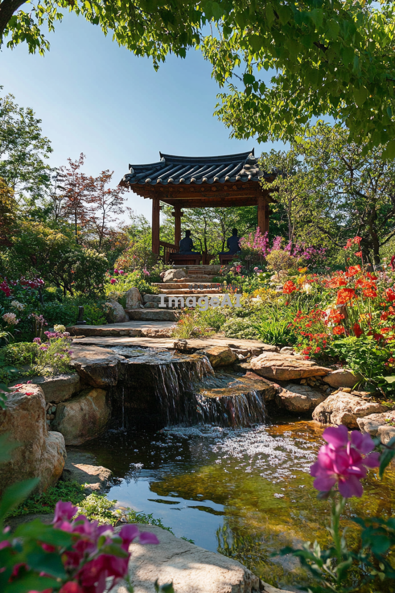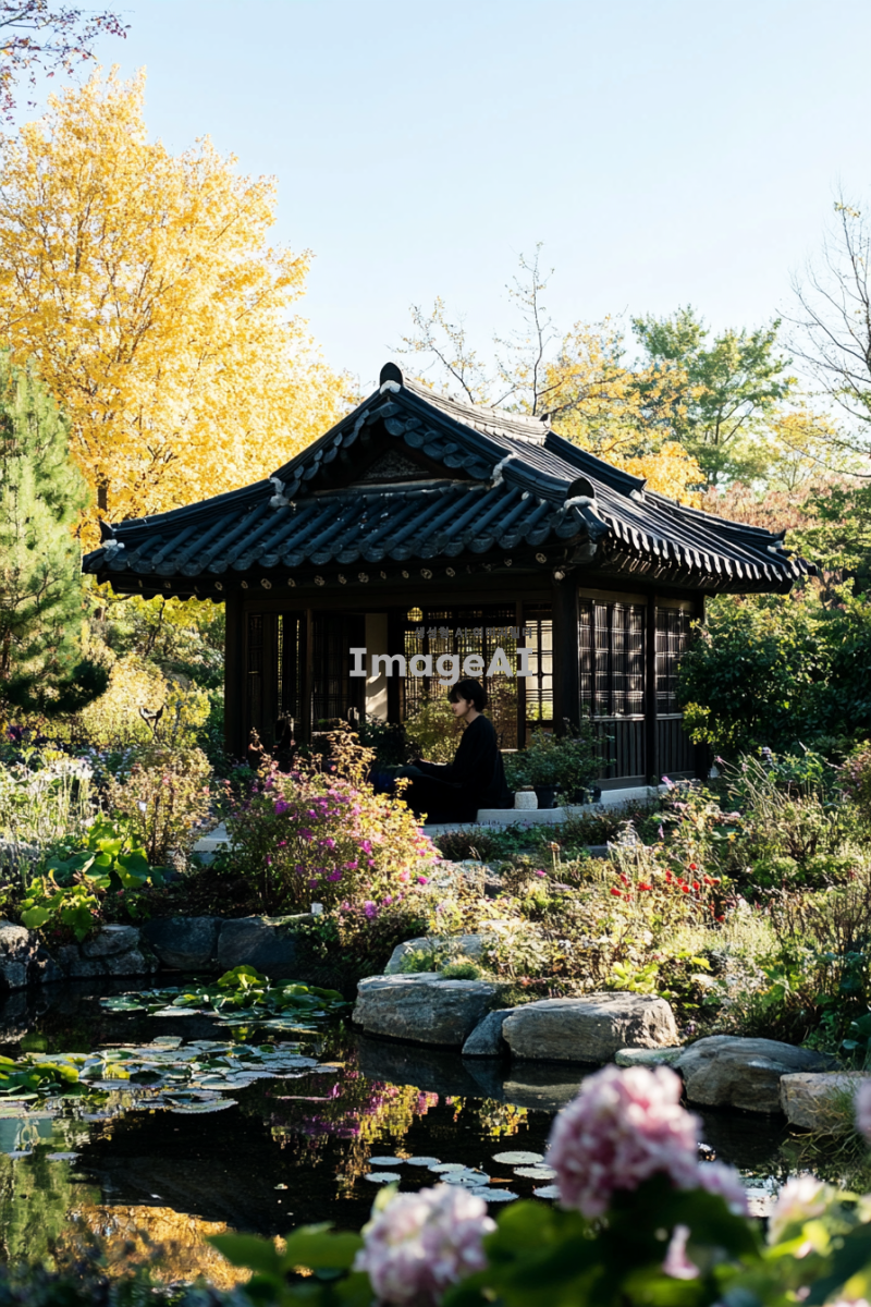 한국 전통 건축 양식으로 지어진 아름다운 정원, 주변에는 다양한 꽃과 나무들이 어우러져 있으며, 정원 중앙에는 조용히 흐르는 작은 연못이 있다. 연못 위에는 전통적인 한국식 정자가 자리 잡고 있으며, 정자 안에는 고요한 분위기 속에서 명상에 잠긴 사람의 모습이 보인다. 푸른 하늘 아래 따뜻한 햇살이 정원을 비추고, 바람에 살랑이는 나뭇잎 소리가 들리는 듯한 평화로운 장면.