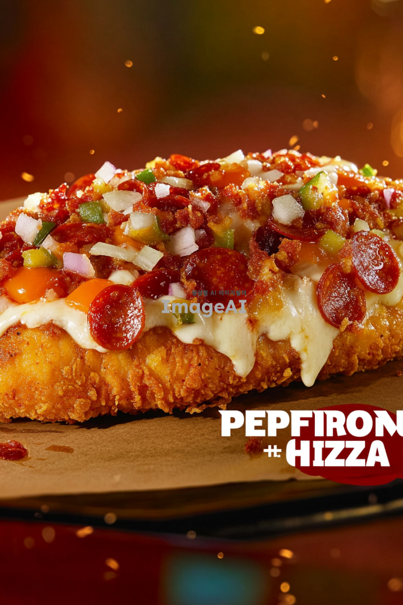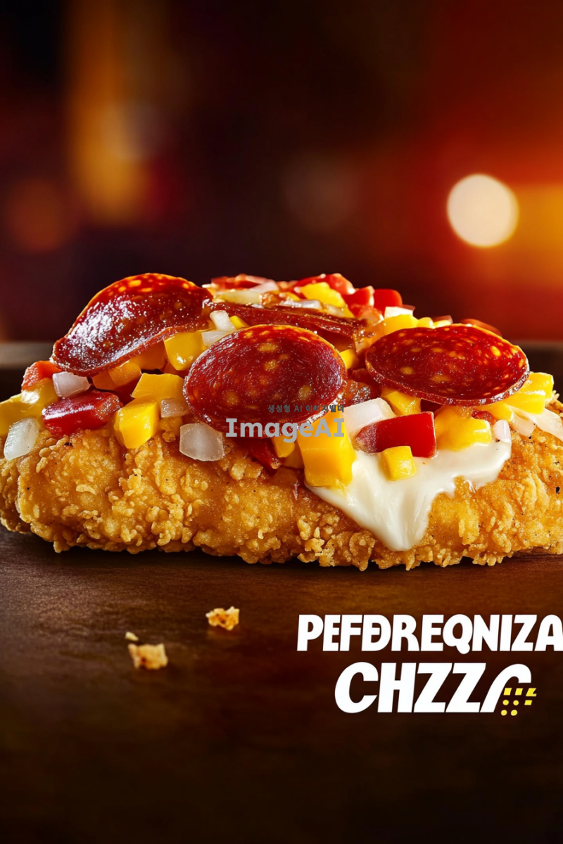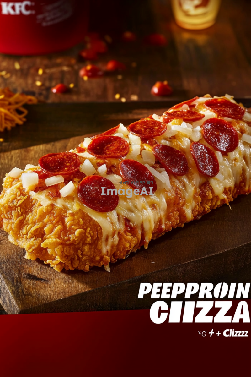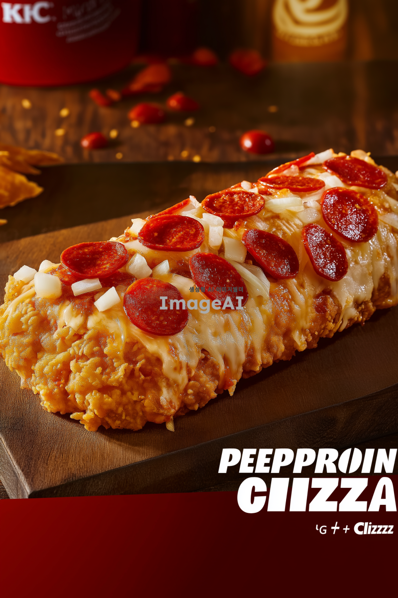 KFC 치킨필렛 위에 페퍼로니와 달콤한 양파, 아삭한 피망, 체다치즈, 모짜렐라 치즈가 올라간 제품 이미지 컷 + KFC 스러운 배경에 합성